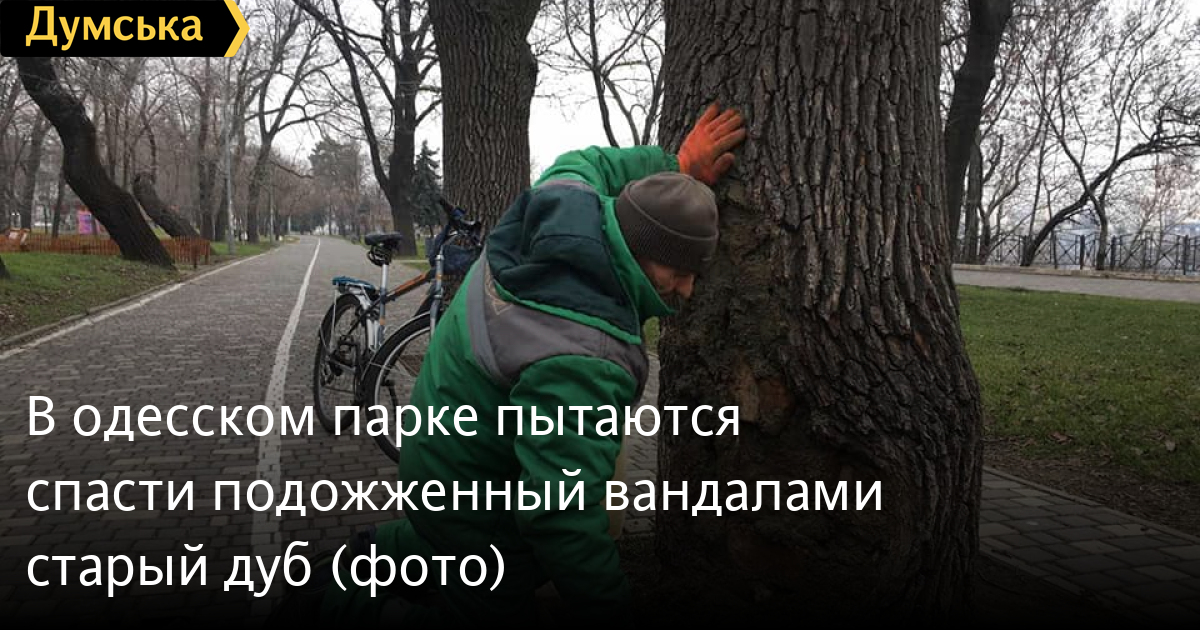 «В последнее время порча городского имущества стала модным развлечением для определенной категории одесситов. Они развлекаются, ломая скамейки, урны и молодые деревья, поджигая контейнеры с мусором, вырубая зеленые насаждения, разбивая окна бытовых помещений коммунальных предприятий Еще одной жертвой вандалов стал дуб, растущий на Суворовской аллее в парке Шевченко. Этому дереву уже больше 80 лет, однако, несмотря на свой возраст, благодаря регулярному и правильному уходу озеленителей, оно было вполне здоровым и радовало одесситов и гостей города», — говорится в сообщении.