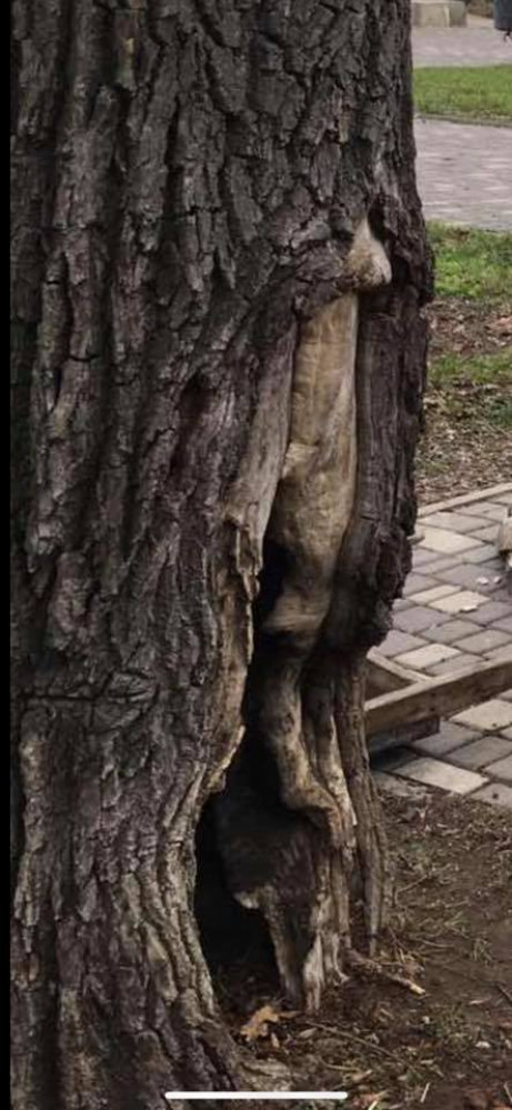 Как известно, живые деревья плохо горят, так что вандалы приложили немало усилий, чтобы развести костер прямо у ствола и в конце концов поджечь его. Дерево выстояло, но ствол сильно пострадал.
