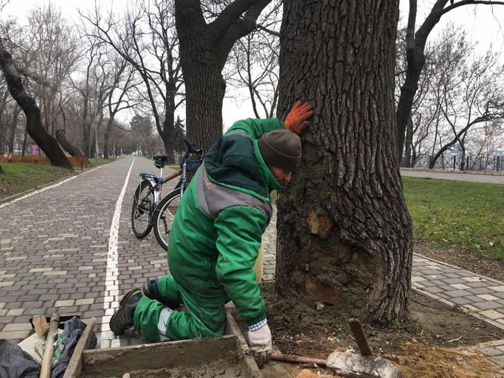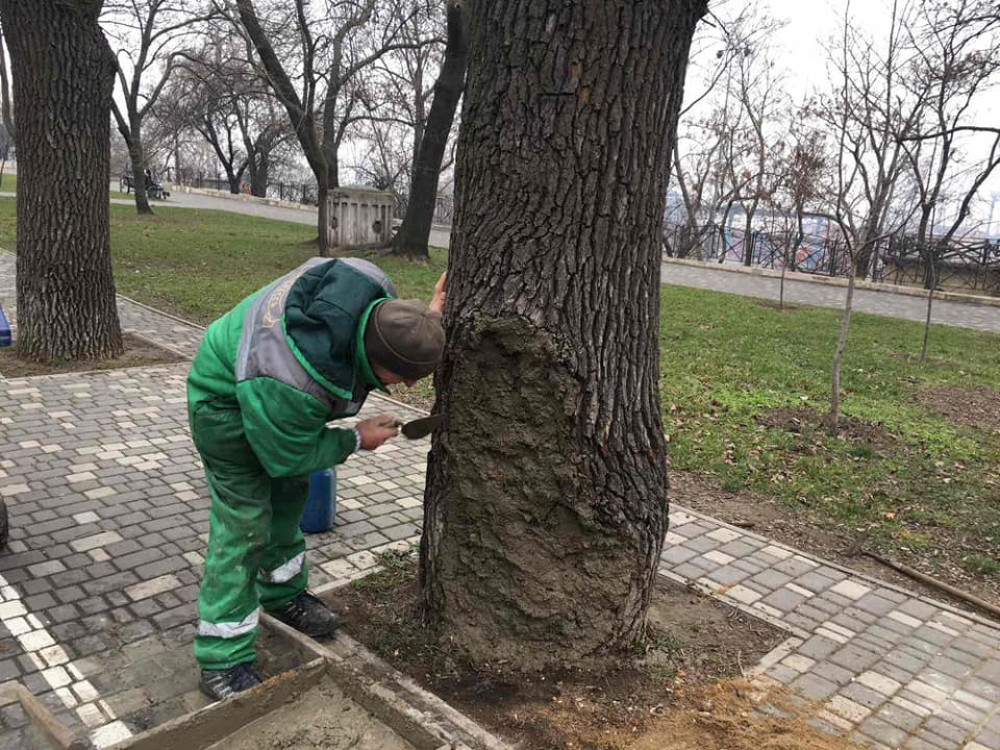 В одесском парке Шевченко сотрудники КП «Горзелентрест» восстанавливают 80-летний дуб, который осенью подожгли неизвестные.