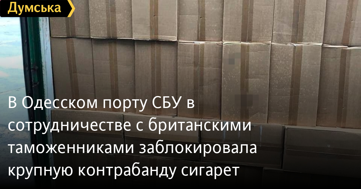 В Одесском порту СБУ в сотрудничестве с британскими таможенниками заблокировала крупную контрабанду сигаретСотрудники Службы безопасности Украины во взаимодействии в Королевской налоговой службой и таможней Великобритании провели спецоперацию в Одесском порту. Как сообщили в СБУ, оперативники задержали контейнер с 16 тоннами контрабандных сигарет, которые направлялись на «черный рынок». Стоимость груза по меньшей мере составляет 20 миллионов гривен. Контрабанду пытались провезти, указав в декларации на груз, что в контейнере текстильные изделия. СМЕРТЬ РОССИЙСКИМ ОККУПАНТАМ! Заметили ошибку? Выделяйте слова с ошибкой и нажимайте control-enter Новости по этой теме: 28 сентября 2021: Присвоил 12 миллионов и сбежал в ОРДЛО: СБУ задержала бывшего топ-чиновника оборонного сектора 25 сентября 2021: Обвиняют в подделке документов: СБУ объявила подозрение теще Шария 24 сентября 2021: Россия заканчивает подгонять образовательную отрасль "ДНР" под свои стандарты – СБУ 24 сентября 2021: Взрывчатка, тротиловые шашки и гранаты: на Львовщине у "общественника" обнаружили опасный тайник |