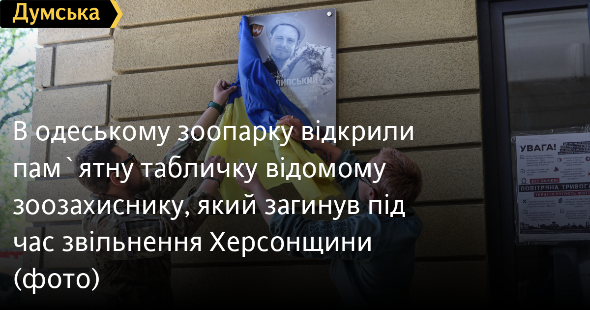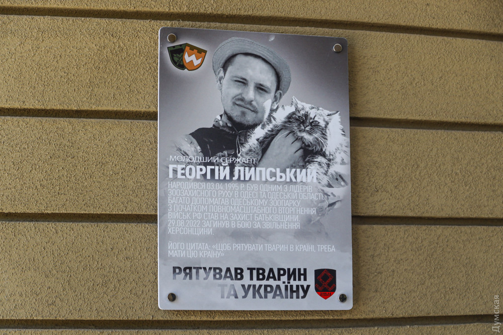 Пам'ятну табличку відомому одеському зоозахиснику, молодшому сержанту Георгію Липському, який загинув 29 серпня минулого року під час визволення Херсонської області, урочисто відкрили сьогодні при вході в одеський зоопарк.