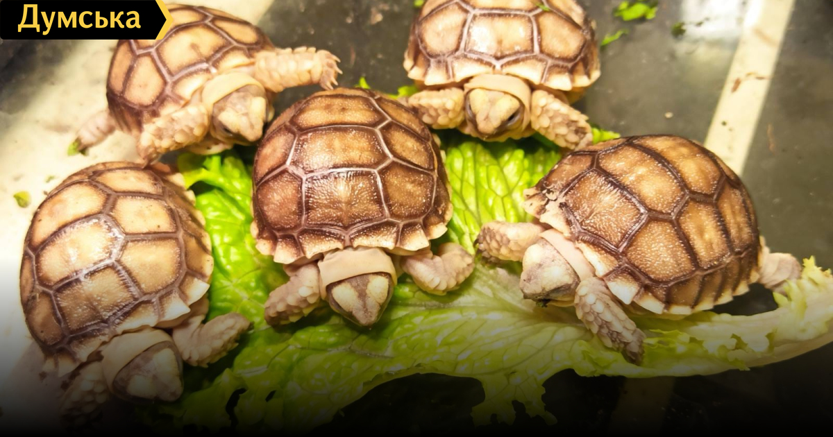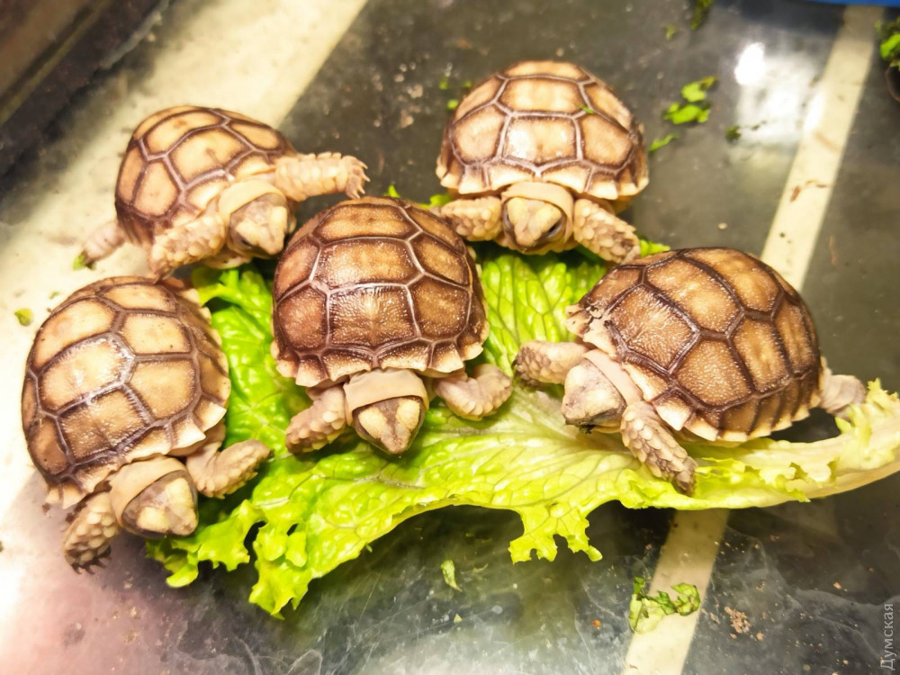 Пять маленьких черепашат вида шпороносная черепаха вылупились вчера днем в акватеррариуме Одесского зоопарка.