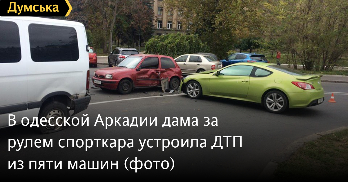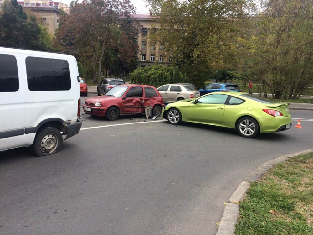 Как сообщает патрульная полиция Одессы, водитель спорткара Hyundai Genesis не справилась с управлением и врезалась в остановившийся Renault. После столкновения Hyundai продолжил движение и врезался в припаркованный Nissan. Renault тем временем отбросило на два других припаркованных авто — Toyota Corolla та Hyundai Sonata.