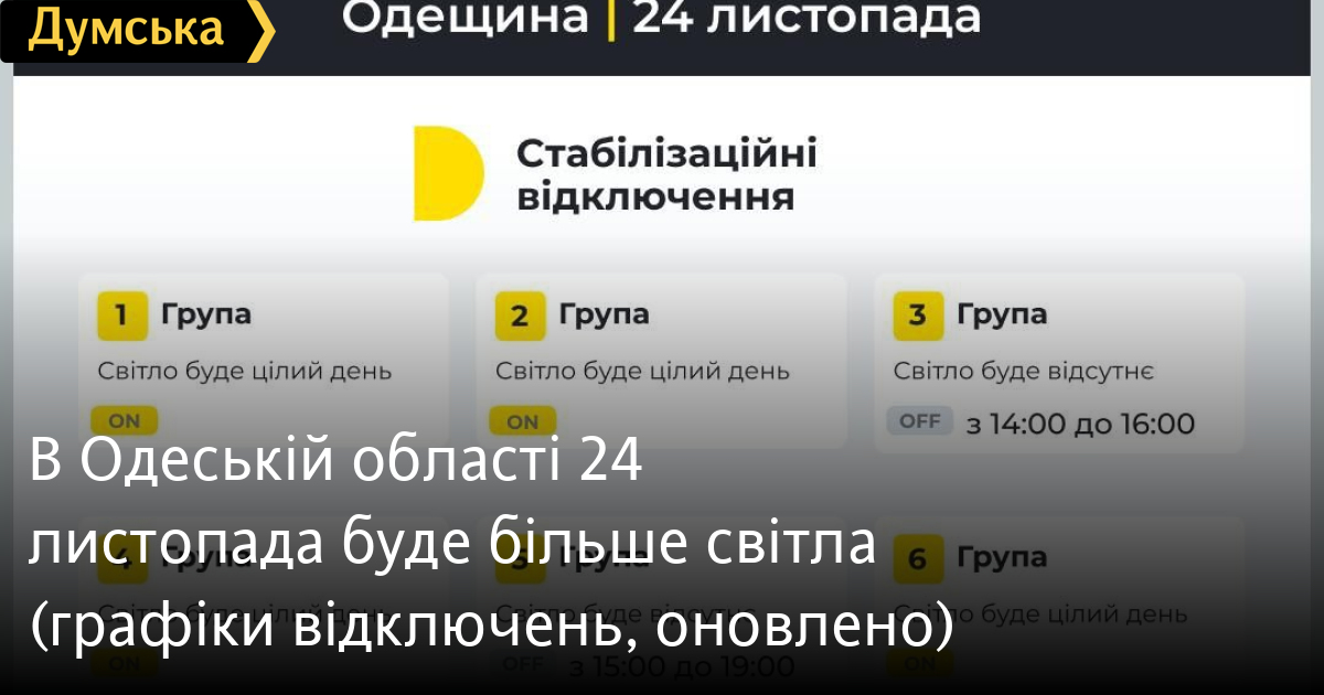 В Одеській області 24 листопада буде більше світла (графіки відключень, оновлено)Графіки відключень електроенергії діятимуть завтра в Одеській області тільки у двох групах і по кілька годин. Як повідомили у пресслужбі ДТЕК, світла не буде в 4-й групі з 14:00 до 17:00 і в 6-й з 16:00 до 19:00. В інших групах електроенергію вимикати не будуть. ОНОВЛЕНО о 20:45. У ДТЕК змінили графіки відключень. Згідно з новими, світла не буде в 3-й групі з 14:00 до 16:00 і в 5-й з 15:00 до 19:00. Помітили помилку? Виділяйте слова з помилкою та натискайте control-enter |