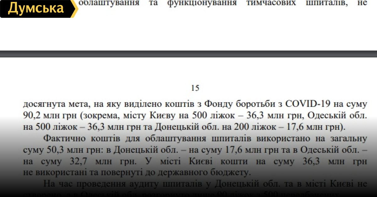 В Одесской области дополнительно развернули лишь 90 ковидных коек из 500 запланированных: потратили 32,7 млн грнВласти Одесской области не справились с задачей по развертыванию временных госпиталей для пациентов с COVID-19. Об этом говорится в отчете Государственной аудиторской службы Украины по результатам проверки использования средств, выделенных из фонда борьбы с коронавирусной инфекцией в 2021 году. Согласно документу, регион получил на развертывание 500 дополнительных коек 36,3 млн, из которых потратил 32,7 млн. При этом реально было развернуто 90 коек. Таким образом, одна койка обошлась государству в 363,3 тыс. грн. «Средства использованы неэффективно и цель, на которую их выделяли, не достигнута», — констатируют аудиторы. Напомним, дополнительные койки планировали развернуть на базе одесского областного Центра социально значимых заболеваний на Ядова, 4. СМЕРТЬ РОСІЙСЬКИМ ОКУПАНТАМ! Помітили помилку? Виділяйте слова з помилкою та натискайте control-enter Новини по цій темі: 4 березня 2023: "Вакцини-довгожителі", або Як щеплення проти COVID-19 перетворилися в Україні на небезпечний ритуал 27 січня 2023: МОЗ зобов`язали опублікувати договори на закупівлю вакцин проти COVID-19: апеляційний суд задовольнив позов журналіста "Думської" 11 січня 2023: За тиждень в Одесі зафіксовано 159 випадків ковіду 4 січня 2023: За тиждень в Одесі зареєстровано 113 випадків ковіду |