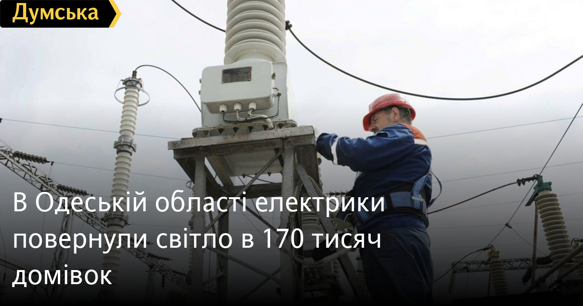 В Одеській області електрики повернули світло в 170 тисяч домівокЕнергетики відновили роботу електромереж в Одеській області після нічного авіаудару. У ДТЕК «Одеські енергомережі» повідомили, що через пошкодження одного з енергетичних об'єктів було відключено 170 тисяч домогосподарств. Зараз абоненти знову зі світлом. Електрики всю ніч працювали, щоб відновити напругу. Ремонтні роботи тривають.«Масових відключень допомагають уникнути сонячні та вітроелектростанції, а також зупинка електротранспорту в Одесі», — зазначили в ДТЕК. СМЕРТЬ РОСІЙСЬКИМ ОКУПАНТАМ! Помітили помилку? Виділяйте слова з помилкою та натискайте control-enter Новини по цій темі: 1 січня: Нічний удар по Одещині: пошкоджено енергетичну інфраструктуру та житлові будинки (фото, відео) 31 грудня 2025: Новорічний наліт: Одеса під ударом російських шахедів 25 грудня 2025: Ворог вночі атакував Одеську область: одна людина загинула, двоє отримали поранення (фото) 23 грудня 2025: Ворог атакував південь Одещини: пошкоджено суховантаж, приватні будинки та енергооб'єкт (фото) 22 грудня 2025: Ворог вночі атакував Одесу: постраждав чоловік, частина Пересипського району залишилася без світла |