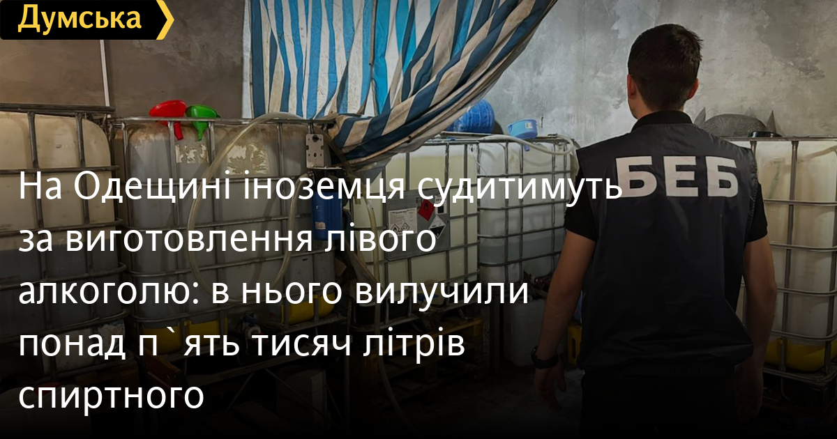 На Одещині іноземця судитимуть за виготовлення лівого алкоголю: в нього вилучили понад п`ять тисяч літрів спиртногоІноземця, який організував виготовлення паленого алкоголю, судитимуть на Одещині. З січня по травень 2023 року він змішував спирт, воду та хімічні концентрати на своєму складі, а потім збував товар на території півдня Одеської області, повідомили в Бюро економічної безпеки. В гаражі, в авто та вдома у нього знайшли понад 5,2 тис. літрів контрафактного алкоголю. Правоохоронці вилучили спирт, готову продукцію, обладнання для виготовлення та розливу алкогольних напоїв, тару, понад 200 тетрапаків, барвники та концентрати. Загальна сума вилученого майна становить понад 1 млн гривень. Фігуранту повідомили про підозру в незаконному виготовленні, зберіганні, збуті або транспортуванні з метою збуту підакцизних товарів. Обвинувальний акт скеровано до суду. СМЕРТЬ РОСІЙСЬКИМ ОКУПАНТАМ! Помітили помилку? Виділяйте слова з помилкою та натискайте control-enter |