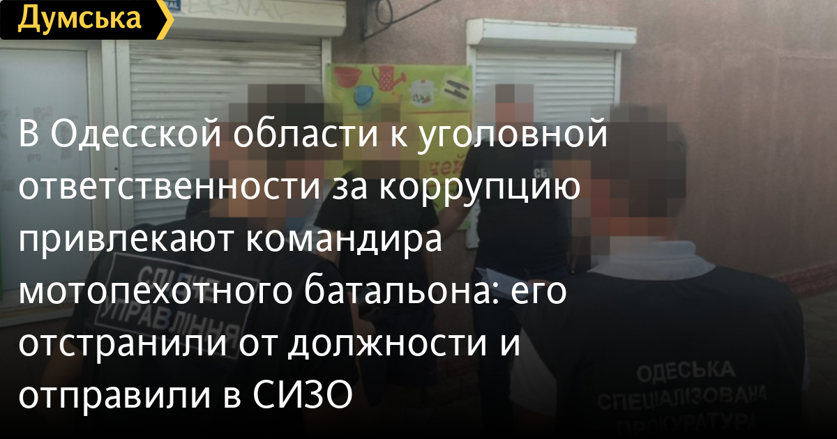 В Одесской области к уголовной ответственности за коррупцию привлекают командира мотопехотного батальона: его отстранили от должности и отправили в СИЗОПо делу о вымогательстве взяток у военнослужащих 11-го отдельного мотопехотного батальона за начисление выплат, положенных фронтовикам, к уголовной ответственности привлекают командира этой воинской части, которая дислоцируется в Подольске Одесской области. Как стало известно «Думской», о подозрении подполковнику Анатолию Шевченко объявили 30 сентября. 7 октября Киевский районный суд Одессы избрал ему меру пресечения в виде содержания под стражей с возможностью выхода на свободу под залог 181 тыс. 600 грн. 13 октября тот же суд отстранил офицера от должности. По данным следствия, командир воинской части, злоупотребляя своим служебным положением, оформлял своим подчиненным выплаты за непосредственное участие в Операции объединенных сил на первой линии обороны. При этом, как установили правоохранители, некоторые из них выполняли задания в тылу и, соответственно, права на такое вознаграждение не имели. В качестве сообщника, утверждают следователи, Шевченко привлек начальника отдела обеспечения охраны государственной тайны, которого задержали в августе, когда он получал 5 тысяч гривен неправомерной выгоды от военнослужащего. 11-й отдельный мотопехотный батальон был сформирован в 2014 году как батальон территориальной обороны «Киевская Русь». В настоящее время входит в состав 59-й отдельной мотопехотной бригады и дислоцируется в Подольске Одесской области. СМЕРТЬ РОССИЙСКИМ ОККУПАНТАМ! Заметили ошибку? Выделяйте слова с ошибкой и нажимайте control-enter |
