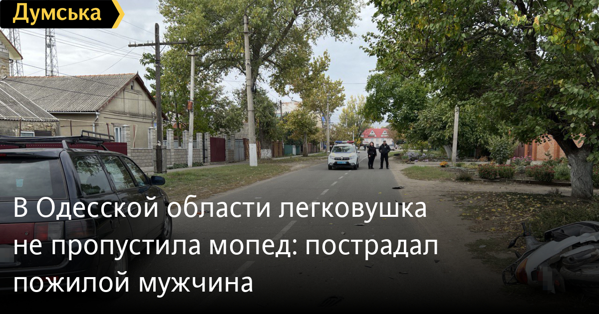 В Одесской области легковушка не пропустила мопед: пострадал пожилой мужчина63-летний мопедист пострадал в результате ДТП, которое произошло в городе Раздельная Одесской области. Как сообщила пресс-служба ГУНП, 71-летний водитель автомобиля ВАЗ не пропустил мопед, который имел преимущество в движении. В результате столкновения водитель мопеда получил травму ноги. Обстоятельства аварии устанавливает следствие. Заметили ошибку? Выделяйте слова с ошибкой и нажимайте control-enter Новости по этой теме: 30 августа 2025: Машина вылетела в кювет: мэр Рени попал в аварию, его мать погибла, а маленький сын в больнице (фото) 18 августа 2025: Трое погибли, один в больнице: на трассе Одесса-Рени водитель Mercedes не пропустила фуру (фото) 28 июля 2025: Пьяный на «Ягуаре» или гипертоник? Уволенный топ-чиновник одесской полиции хочет вернуться на службу 2 апреля 2025: В Одессе водитель BMW спровоцировал аварию, в которой пострадали пять человек, и сбежал (фото, видео) 17 марта 2025: Непрофессионализм или злой умысел? В Одессе аварию с двумя пострадавшими оформили как админнарушение 30 декабря 2024: Начали отмечать: в Одессе резко скакнуло количество дорожных аварий |