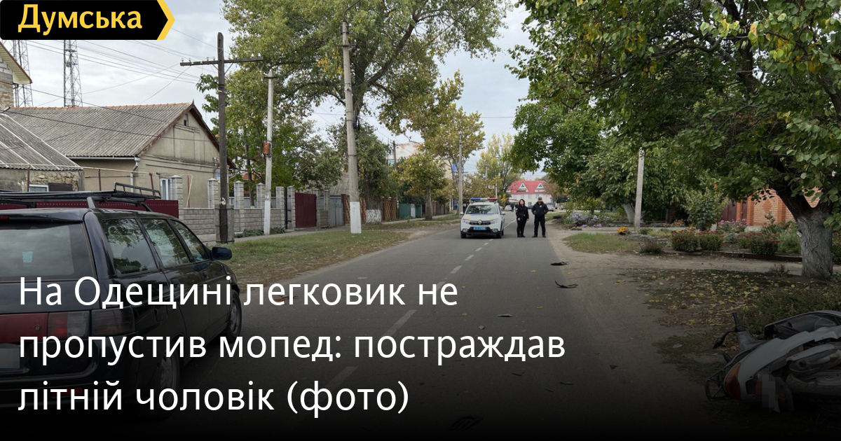 На Одещині легковик не пропустив мопед: постраждав літній чоловік63-річний мопедист постраждав унаслідок ДТП, яка сталася в місті Роздільна Одеської області. Як повідомила пресслужба ГУНП, 71-річний водій автомобіля ВАЗ не пропустив мопед, який мав перевагу в русі. У результаті зіткнення водій мопеда отримав травму ноги. Обставини аварії встановлює слідство. Помітили помилку? Виділяйте слова з помилкою та натискайте control-enter Новини по цій темі: 30 серпня 2025: Машина вилетіла в кювет: мер Рені потрапив в аварію, його мати загинула, а маленький син у лікарні (фото) 18 серпня 2025: Троє загинули, один у лікарні: на трасі Одеса-Рені водій Mercedes не пропустив фуру (фото) 28 липня 2025: П'яний на "Ягуарі" або гіпертонік? Звільнений топ-посадовець одеської поліції хоче повернутися на службу 2 квітня 2025: В Одесі водій BMW спровокував аварію, в якій постраждали п`ятеро людей, і втік (фото, відео) |