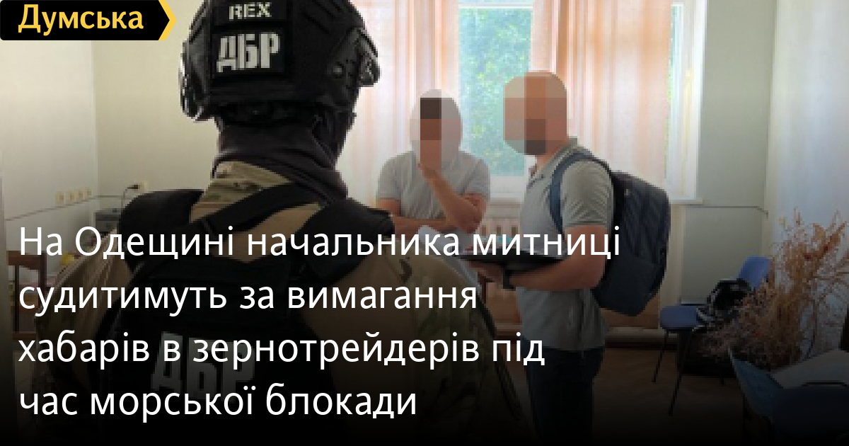 На Одещині начальника митниці судитимуть за вимагання хабарів в зернотрейдерів під час морської блокадиНачальник митного посту «Рені», який вимагав хабарі з експортерів зернових під час блокади українських портів, постане перед судом. Він отримував від брокерів фіксовану суму за оформлення документів на експорт зерна, повідомили в ДБР. В умовах воєнного стану та блокади портів митник встановив таксу на кожну фуру та на видачу Сертифікатів про походження товарів з України на кожне авто. Правоохоронці затримали посадовця «на гарячому» на отриманні лише від одного митного брокера понад 150 тис. грн за безперешкодне оформлення автомобілів із зерновими культурами та видачу 15 сертифікатів. Фігуранта обвинувачують в одержанні неправомірної вигоди службовою особою, яка займає відповідальне становище (ч. 3 ст. 368 КК України). Йому загрожує до десяти років ув'язнення. СМЕРТЬ РОСІЙСЬКИМ ОКУПАНТАМ! Помітили помилку? Виділяйте слова з помилкою та натискайте control-enter Новини по цій темі: 15 липня 2025: Вимагала 400 євро за підробку документів для пенсії: в Одеській області чиновниця попалася на хабарі (фото, відео) 27 червня 2025: За 40 тис. грн хотів купити секретні розробки: в Одесі затримали співробітника приватної фірми 6 червня 2025: Вимагав три тисячі доларів за довідку про інвалідність: в Одесі затримали головлікаря лікарні (фото) 8 травня 2025: Обіцяли оформити програмістом в комунальне підприємство: в Одеській області викрили схему ухилення від армії |