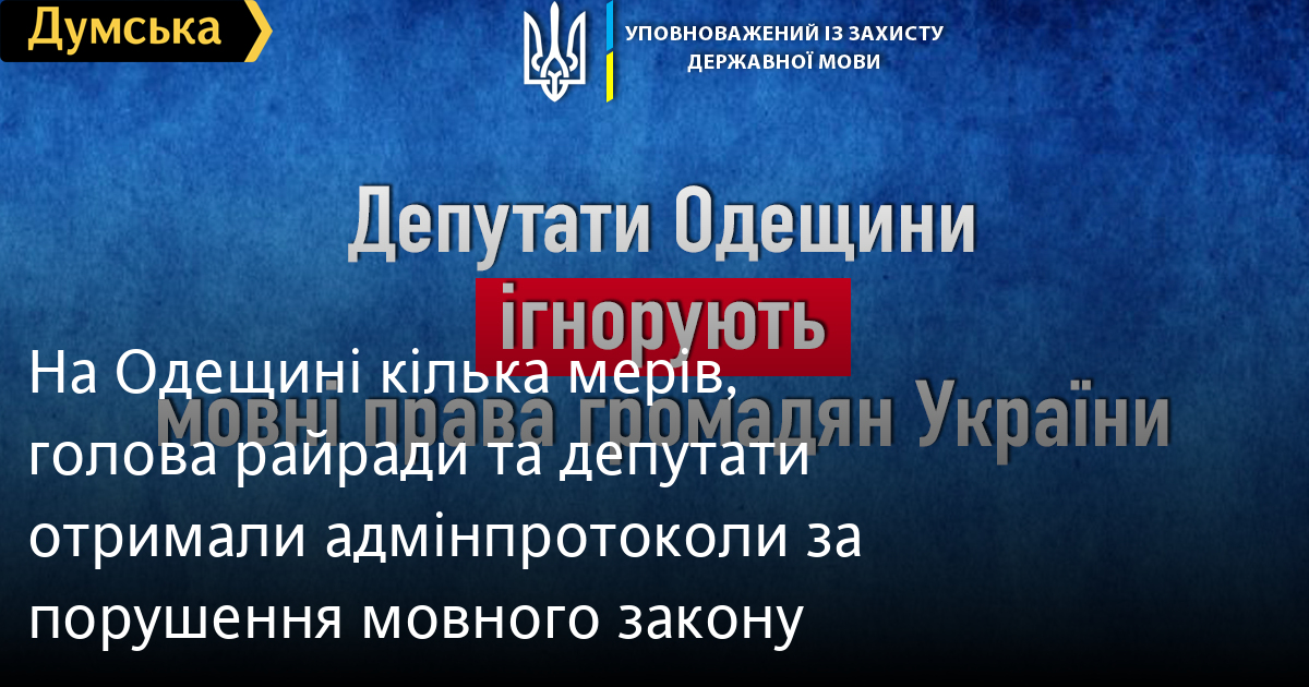 На Одещині кілька мерів, голова райради та депутати отримали адмінпротоколи за порушення мовного законуШтрафи загрожують представникам місцевого самоврядування на Одещині за те, що депутати та чиновники не використовували українську мову під час роботи. Уповноважений із захисту державної мови Тарас Кремень повідомив, що у списку порушників: ексголова Білгород-Дністровської райради Григорій Мельниченко, мер Болграда Сергій Димитрієв, міський голова Кодими Сергій Лупашко, а також депутат Болградської міськради, двоє депутатів Одеської міськради, депутат Овідіопольської селищної ради та депутат Южненської міськради. Вони порушили вимоги мовного закону під час сесій, засідань комісій та звітів перед виборцями. Кремінь зазначив, що подібні порушення для чиновників можуть спричинити штрафи у розмірі від 3400 до 8500 гривень за перше порушення та від 8500 до 11 тис. 900 грн за повторне. Омбудсмен заявив, що на Одещині успішно реалізовується програма розвитку української мови, проте Одеса відстає від загальної тенденції. З відкритих у регіоні 19 безкоштовних мовних курсів лише декілька працює в обласному центрі, що для міста-мільйонника катастрофічно мало. Помітили помилку? Виділяйте слова з помилкою та натискайте control-enter