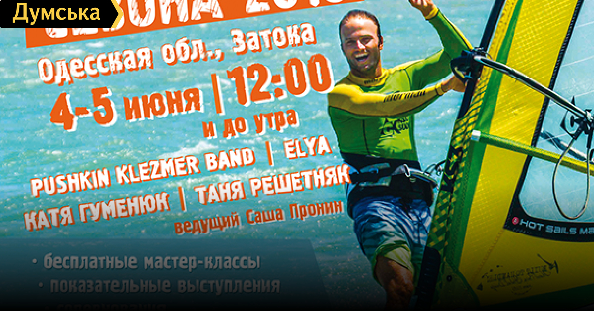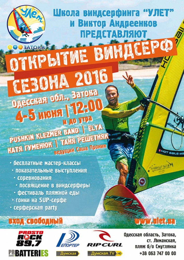 В первые выходные июня в Одесской области состоится праздничное открытие нового сезона виндсерфинга 2016 года. Мероприятие пройдет в неформальной украинской столице этого вида спорта – поселке Затока, на территории школы виндсерфинга «Улет». В программе открытия: бесплатные мастер-классы и показательные выступления профессиональных спортсменов-виндсерферов, зрелищная церемония первого в сезоне выхода на воду, гонки на SUP-серфах, фестиваль пляжной еды, разнообразные викторины и конкурсы с серферскими призами от RipCurl. Каждый желающий также сможет попробовать научиться кататься на виндсерфе у опытных серф-инструкторов школы «Улет», которая вот уже шестой год подряд традиционно выступает организатором открытия. Вечером гостей ждет веселая церемония посвящения новичков в виндсерферы, танцевальный флешмоб и флирт-марафон, концерт The Pushkin Klezmer Band, Татьяны Решетняк (ex-«Горячий Шоколад»), Кати Гуменюк (ex-Ассоль) и DJ-set от ELYA. Ведущим открытия станет Саша Пронин. «Мы рады пригласить всех на наше мероприятие, чтобы присоединиться к дружной семье виндсерферов, получить дозу адреналина и приобщиться к здоровому образу жизни», — говорит основатель «Улета» Виктор Андреенков. Открытие будет проходить 4 и 5 июня с 12:00 до полуночи. Вход — свободный. Подробнее программу открытия и другую полезную информацию можно узнать на сайте школы «Улет», на ее СМЕРТЬ РОСІЙСЬКИМ ОКУПАНТАМ! Помітили помилку? Виділяйте слова з помилкою та натискайте control-enter |