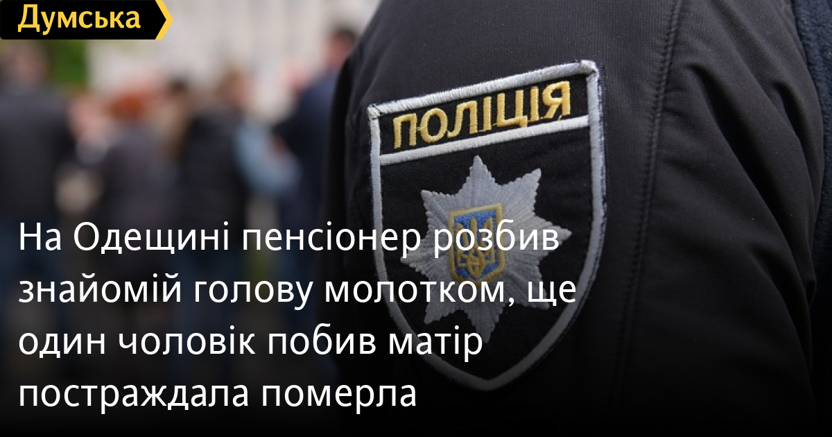 На Одещині пенсіонер розбив знайомій голову молотком, ще один чоловік побив матір – постраждала померлаДва випадки нападу на жінок сталися на Одещині. Внаслідок одного з інцидентів жертва померла. В обласній поліції повідомили, що на Одещині 77-річний чоловік напав з молотком на 78-річну знайому, яка принесла йому продукти. Гостя отримала кілька ударів, змогла вибратися з житла, де її закривавлену помітив сусід та викликав поліцію та швидку допомогу. Другий інцидент стався у Березівському районі. Там 48-річний чоловік під час пиятики побив свою 69-річну матір. Фігурант кілька разів ударив жінку в обличчя, а коли вона впала, то побив її ногами. За кілька годин постраждала померла. Затриманим оголосили підозри у скоєнні злочинів, кваліфікованих ч.1 ст.121 (навмисні тяжкі тілесні ушкодження) та ч.2 ст.121 (навмисні тяжкі тілесні ушкодження, що спричинили смерть потерпілого) Кримінального кодексу України. Помітили помилку? Виділяйте слова з помилкою та натискайте control-enter |
