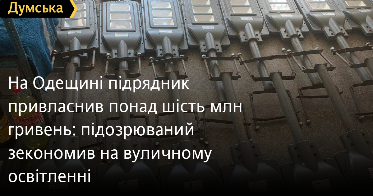 На Одещині підрядник привласнив понад шість млн гривень: підозрюваний зекономив на вуличному освітленніКерівнику підрядної компанії повідомили про підозру у розкраданні 6 млн грн на благоустрої. Він уклав із селищною радою угоди про дорожній ремонт та декілька місяців вносив в акти виконаних робіт неправдиві дані, повідомили в Одеській обласній прокуратурі. Директору компанії-підрядника повідомили про підозру за фактом службового підроблення та привласнення бюджетних коштів. Він мав капітально відремонтувати вулиці у двох населених пунктах колишнього Великомихайлівського району. Зокрема, обладнати автоматизоване освітлення доріг світильниками потужністю 100-120 ватт з вбудованою сонячною панеллю, датчиком світла, акумулятором і таймером зниження потужності. Загальна вартість робіт — 9 млн гривень. Експертиза встановила, що фактично роботи коштували 2,5 млн грн, оскільки освітлення вулиць проведено лише частково, а замість передбачених 100-120 ват встановлені світильники потужністю 60 ват, які втричі дешевші. Таким чином підозрюваний заволодів понад 6 млн грн бюджетних коштів, які витратив на власний розсуд. СМЕРТЬ РОСІЙСЬКИМ ОКУПАНТАМ! Помітили помилку? Виділяйте слова з помилкою та натискайте control-enter |