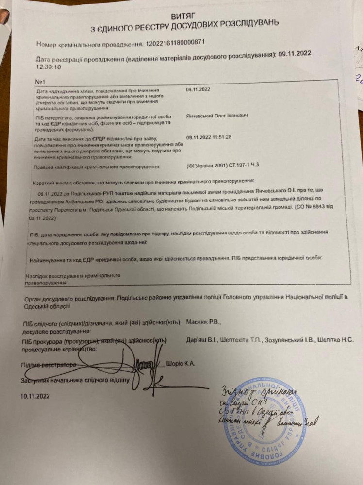 Кримінальне провадження щодо сина в.о. мера Подільська, «слуги» Олега Албанського Ростислава, який самовільно будує магазин на землі, що належить міській громаді, відкрили слідчі місцевого управління поліції 9 листопада.