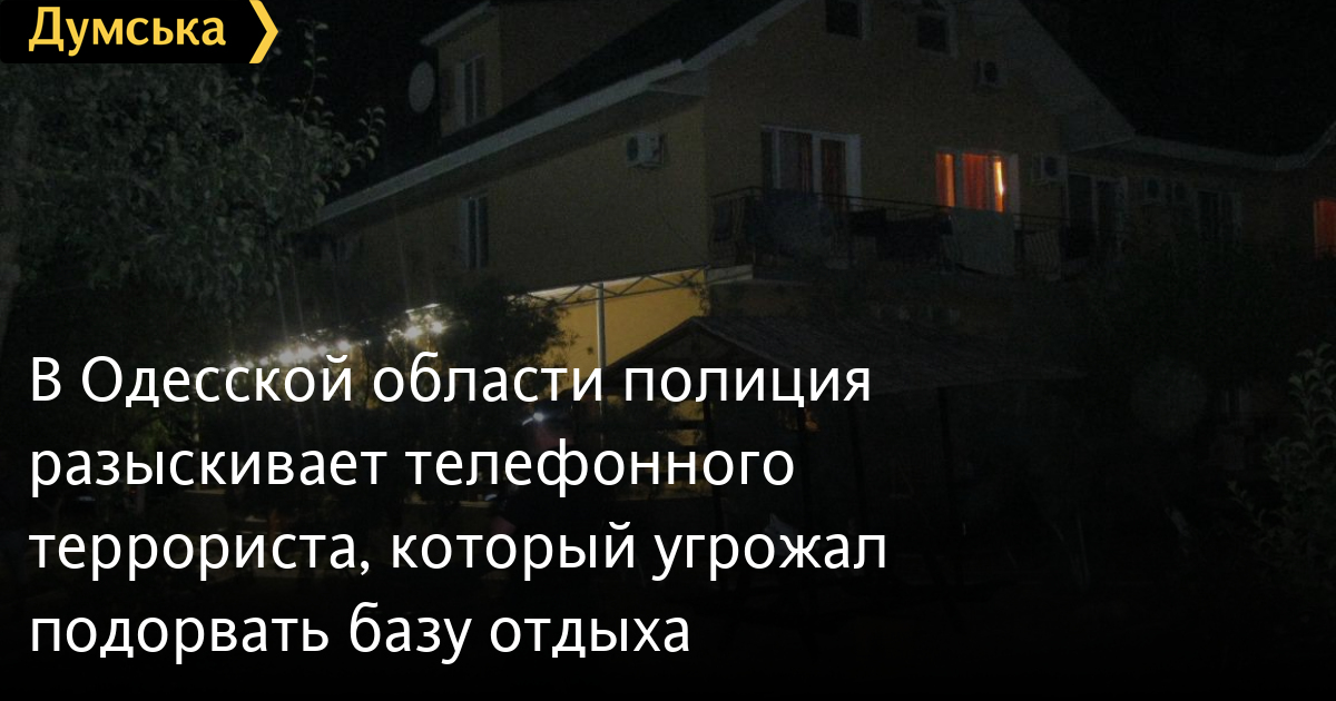 В Одесской области полиция разыскивает «телефонного террориста», который угрожал подорвать базу отдыхаПолиция разыскивает мужчину, который вечером 17 августа позвонил на 102 и оставил заведомо неправдивое сообщение о бомбе, заложенной на территории базы отдыха на Будакской косе. Как сообщили в ГУНП, после поступивших угроз поздно вечером пришлось эвакуировать 200 постояльцев и сотрудников базы отдыха. Взрывотехники осмотрели территорию и корпуса и не обнаружили никаких подозрительных предметов. Открыто уголовное производство по ч.1 ст.259 УК Украины (заведомо ложное сообщение об угрозе безопасности граждан, уничтожения или повреждения объектов собственности). Телефонному шутнику грозит от 2 до 8 лет тюрьмы. По данным «Думской», фигурант угрожал взорвать базу отдыха «Ника 2». Полиция установила номер телефона, с которого он звонил. СМЕРТЬ РОССИЙСКИМ ОККУПАНТАМ! Заметили ошибку? Выделяйте слова с ошибкой и нажимайте control-enter Новости по этой теме: 4 августа 2025: Экспертизу не сделали, камеры не отсмотрели: одесские волонтеры жалуются на саботаж полиции в расследовании убийства собаки 29 июля 2025: В Усатово Одесской области произошла перестрелка: полиция работает на месте (видео, обновлено) 28 июля 2025: Пьяный на «Ягуаре» или гипертоник? Уволенный топ-чиновник одесской полиции хочет вернуться на службу 19 июня 2025: Девочку, которую искали сотни одесситов, нашли убитой: полиция работает с мужчиной, вероятно, причастным к гибели |
