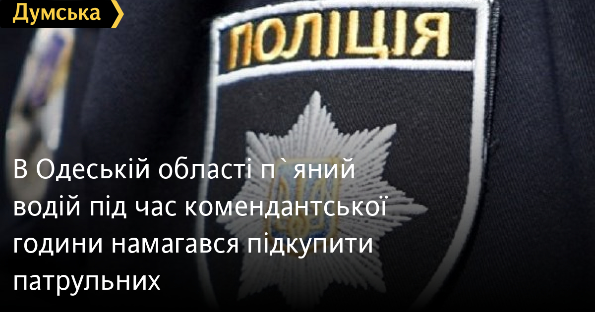 В Одеській області п`яний водій під час комендантської години намагався підкупити патрульнихПоліцейські затримали 54-річного чоловіка, який під час комендантської години їхав п'яним по смт Таїрове, а після зупинки автомобіля намагався підкупити патрульних. «Думській» у правоохоронних органах повідомили, що інцидент стався вночі 17 грудня на Старолюстдорфській дорозі. Водій автомобіля Hyundai Creta з явними ознаками алкогольного сп'яніння пропонував патрульним 500 доларів. Ті, своєю чергою, викликали слідчо-оперативну групу. Відкрито кримінальне провадження за ст.369 (пропозиція хабара посадовій особі). Помітили помилку? Виділяйте слова з помилкою та натискайте control-enter Новини по цій темі: 29 липня 2025: В Усатово Одеської області сталася перестрілка: поліція працює на місці (відео, оновлено) 28 липня 2025: П'яний на "Ягуарі" або гіпертонік? Звільнений топ-посадовець одеської поліції хоче повернутися на службу 19 червня 2025: Дівчинку, яку шукали сотні одеситів, знайшли вбитою: поліція працює з чоловіком, ймовірно причетним до загибелі 27 травня 2025: Увели гектар в університету: на Одещині засудили земельних аферистів, але без посадки і Хвоста |