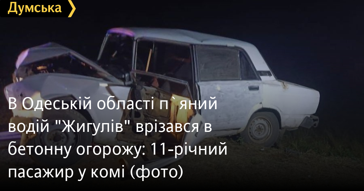 В Одеській області п`яний водій «Жигулів» врізався в бетонну огорожу: 11-річний пасажир у коміП'яний 24-річний автомобіліст за кермом «Жигулів» увечері 20 серпня врізався в бетонну огорожу мосту між селами Демидове і Михайло-Олександрівка в Березівському районі. У поліції повідомили, що внаслідок удару серйозно постраждав 11-річний хлопчик, який перебував на пасажирському сидінні — дитину госпіталізували у стані коми із закритою черепно-мозковою травмою та струсом мозку. Автомобіліст отримав забої та струс мозку і також опинився в лікарні. Тест на алкоголь показав, що в крові чоловіка було 3,36 проміле алкоголю. Відкрито кримінальне провадження за ст.286-1 (порушення ПДР у стані сп'яніння, що спричинило тяжке тілесне ушкодження). Водієві загрожує від п'яти до восьми років в'язниці. Помітили помилку? Виділяйте слова з помилкою та натискайте control-enter Новини по цій темі: 30 серпня 2025: Машина вилетіла в кювет: мер Рені потрапив в аварію, його мати загинула, а маленький син у лікарні (фото) 18 серпня 2025: Троє загинули, один у лікарні: на трасі Одеса-Рені водій Mercedes не пропустив фуру (фото) 28 липня 2025: П'яний на "Ягуарі" або гіпертонік? Звільнений топ-посадовець одеської поліції хоче повернутися на службу 2 квітня 2025: В Одесі водій BMW спровокував аварію, в якій постраждали п`ятеро людей, і втік (фото, відео) |