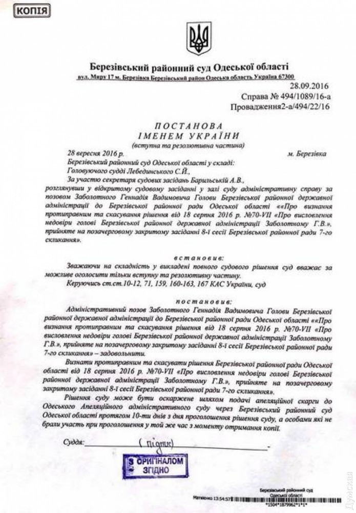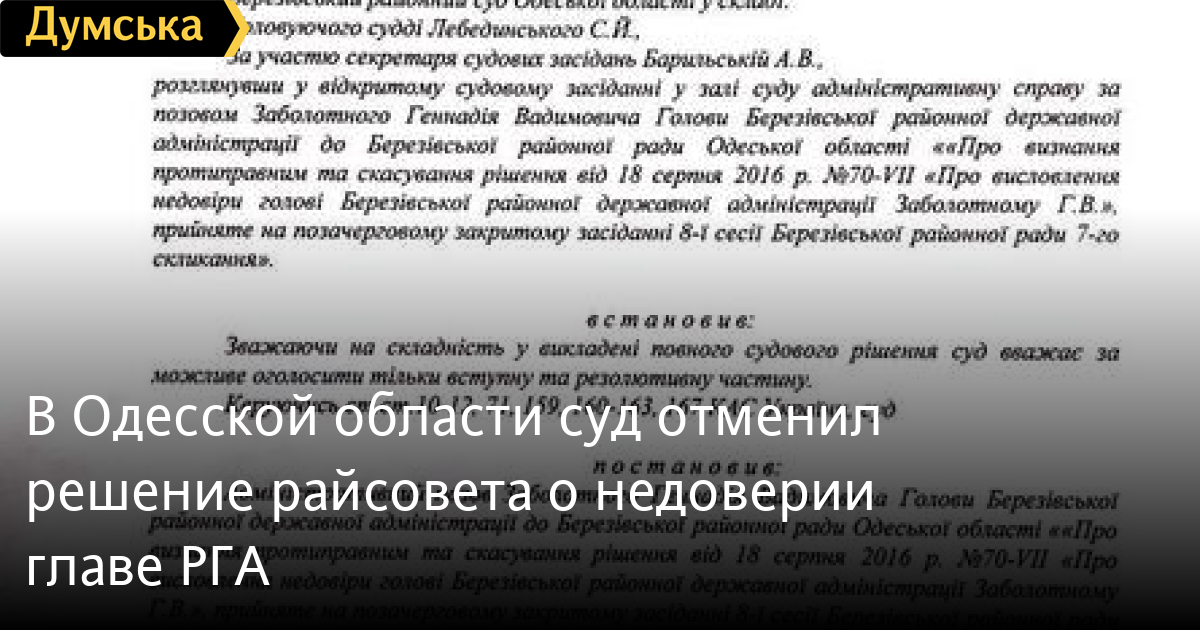 Березовский районный суд Одесской области отменил как незаконное решение местного райсовета о недоверии главе РГА Геннадию Заболотному, принятое на сессии 18 августа. Об этом «Думской» сообщили в администрации. По мнению суда, вотум был принят с нарушением процедуры и регламента совета. Напомним, за недоверие проголосовали 25 из 34 депутатов собрания. «Формальным поводом стало признание неудовлетворительным отчета о работе Заболотного с сентября 2015 по июль 2016 года. На самом же деле недоверие выразили из-за активной борьбы главы РГА с коррупционными схемами», — отметили в администрации. Отметим, что, по данным «Думской», голосование стало возможным благодаря давней дружбе местного «ОппоБлока» и «Батькивщины». 50-летний Геннадий Заболотный — уроженец Гайворона Кировоградской области. В 1990 году окончил Кировоградский институт машиностроения, потом занимался бизнесом. Был депутатом Кировоградского областного совета, а также членом исполнительного комитета города Кировограда (Кропивницкого). Заболотный является президентом Федерации легкой атлетики Кировоградской области. Женат, воспитывает троих детей. СМЕРТЬ РОССИЙСКИМ ОККУПАНТАМ! Заметили ошибку? Выделяйте слова с ошибкой и нажимайте control-enter |