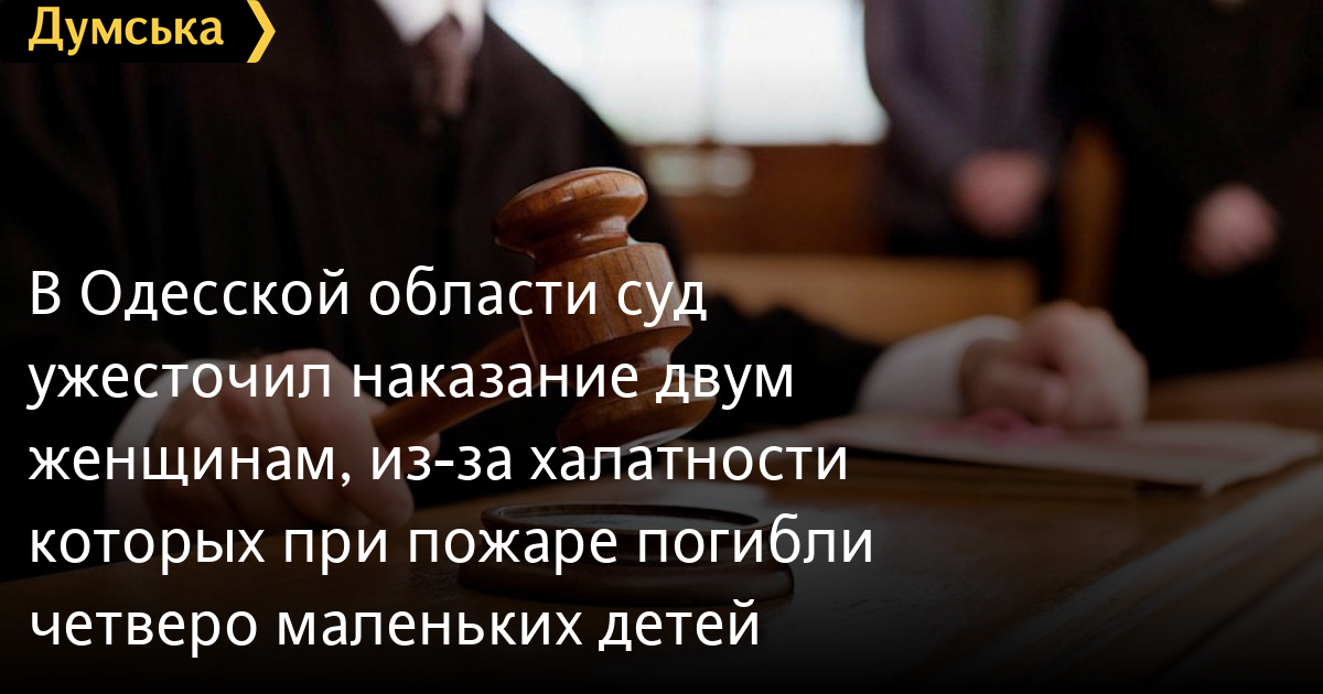 На Одещині суд посилив покарання двом жінкам, через недбальство яких у пожежі загинули четверо маленьких дітейАпеляційний суд змінив вирок двом мешканкам села Чорне Подільського району Одеської області, у яких у пожежі в ніч проти 1 липня 2019 року загинули четверо маленьких дітей. Як повідомили в обласній прокуратурі, суд посилив покарання – з трьох років позбавлення волі з дворічним випробувальним строком до двох років реального ув'язнення. Нагадаємо, фігурантки 18 та 23 років залишили в будинку маленьких дочок і вирушили випивати, після чого заснули. Під час їхньої відсутності у будинку спалахнула пожежа, залишені без нагляду діти загинули. Помітили помилку? Виділяйте слова з помилкою та натискайте control-enter |