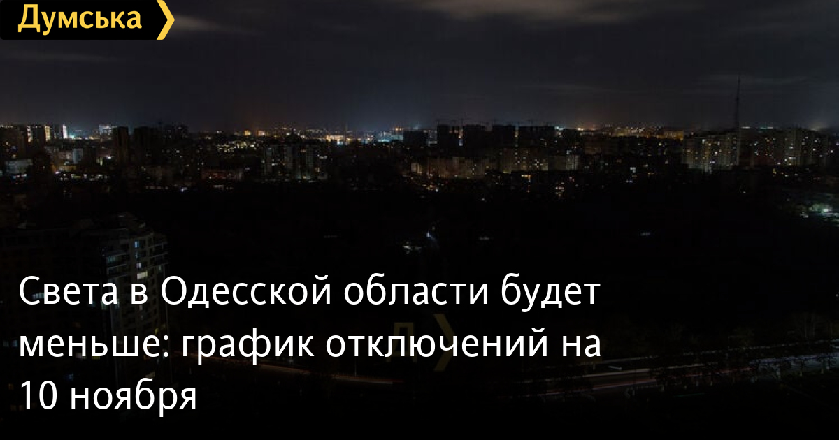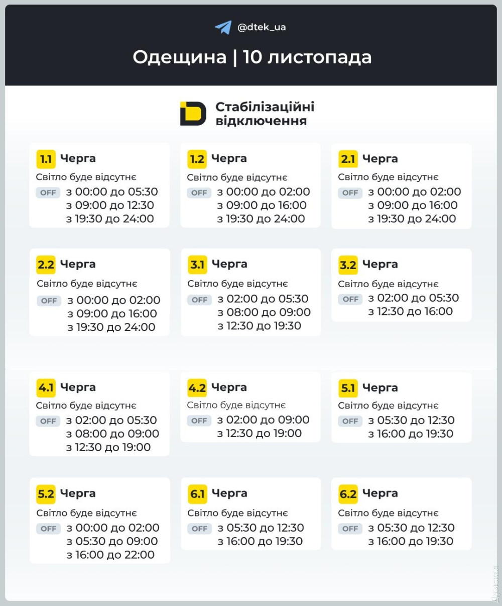 Світла на Одещині буде менше: графік відключень на 10 листопадаОновлений графік стабілізаційних відключень електроенергії на понеділок, 10 листопада, оприлюдни у ДТЕК. У більшості груп передбачено по два-три періоди без світла тривалістю від 2 до 5 годин. Нагадаємо, стабілізаційні графіки застосовують для балансування енергосистеми. Ситуація в енергетиці залишається складною через дефіцит потужностей після масованих російських атак. Споживачів закликають не перенавантажувати мережі. Перевірити, в якій ви групі, та подивитися на свій графік відключень можна тут або в чат-боті ДТЕК. В разі змін, абонентів оперативно інформуватимуть у Telegram-каналі. СМЕРТЬ РОСІЙСЬКИМ ОКУПАНТАМ! Помітили помилку? Виділяйте слова з помилкою та натискайте control-enter |