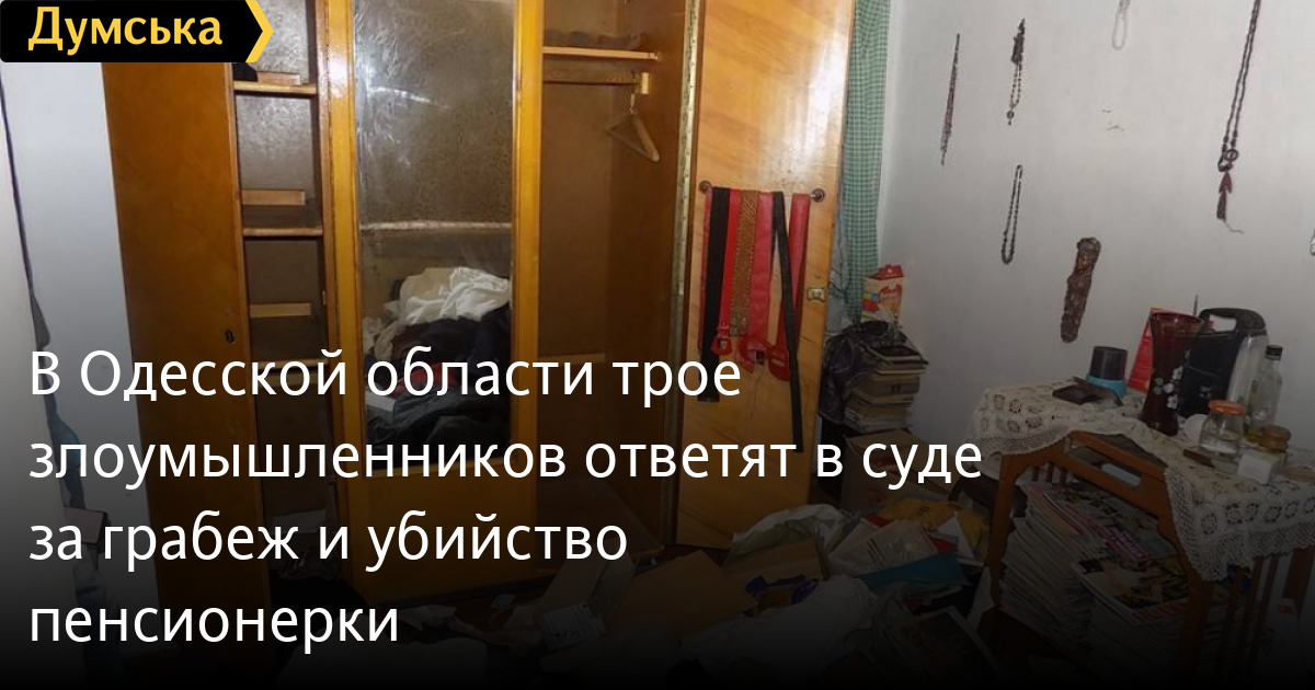 В Одесской области трое злоумышленников ответят в суде за грабеж и убийство пенсионеркиБелгород-Днестровская местная прокуратура направила в суд обвинительный акт в отношении трех местных жителей, которые подозреваются в разбойном нападении и жестоком убийстве пенсионерки в мае этого года. Как сообщает пресс-служба прокуратуры, нападение на одинокую женщину организовал 38-летний ранее судимый житель Белгорода-Днестровского. Он предложил своему родственнику ограбить 69-летнюю пенсионерку. А тот привлек несовершеннолетнего знакомого. Придя в дом жертвы, мужчины жестоко избили и задушили ее полотенцем. После этого злоумышленники забрали серебряную цепочку, деньги (174 грн), DVD-проигрыватель и иконы. СМЕРТЬ РОССИЙСКИМ ОККУПАНТАМ! Заметили ошибку? Выделяйте слова с ошибкой и нажимайте control-enter |