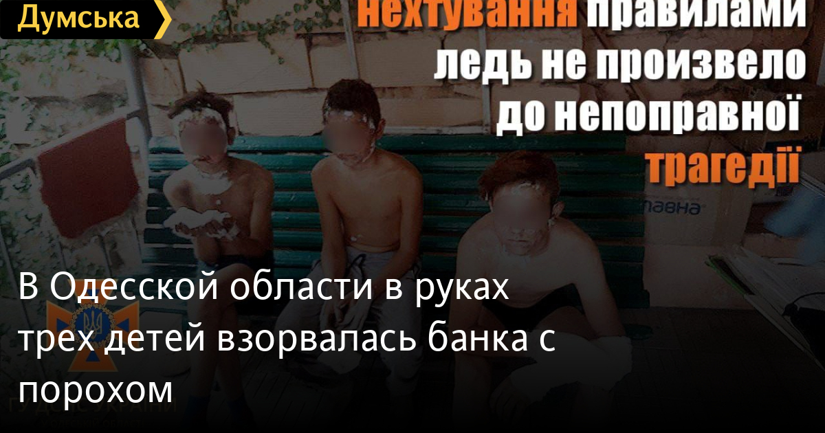 Двоє 15-річних хлопчиків та їхній 12-річний друг на Одещині знайшли банку з порохом і вирішили з нею пограти, внаслідок чого стався вибух. За даними Держслужби з надзвичайних ситуацій, діти зазнали серйозних опіків. Один 12-річний хлопчик отримав опіки обличчя, рук та ніг (21-24% тіла) І, ІІ та ІІІ ступенів. Його товариші отримали опіки рук та обличчя (3-4% тіла) І-ІІ ступенів. Постраждалих дітей негайно госпіталізували до хірургічного відділення та надали їм необхідну допомогу. Після цього рятувальники провели із ними профілактичну бесіду. Помітили помилку? Виділяйте слова з помилкою та натискайте control-enter |