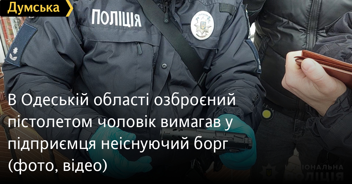 В Одеській області озброєний пістолетом чоловік вимагав у підприємця неіснуючий борг (фото, відео)Поліція затримала жителя Шабської громади, який погрожував місцевому підприємцю розправою та вимагав заплатити 500 доларів вигаданого боргу. В обласному управлінні Нацполіції повідомили, що під час особистих зустрічей і телефонних дзвінків фігурант погрожував знищити майно бізнесмена та заподіяти шкоду йому особисто та його родичам. У результаті потерпілому довелося заплатити, після чого зловмисника затримали. Під час обшуку у здирника виявили пістолет і 34 патрони. Йому інкримінують вимагання та незаконне поводження зі зброєю, за що чоловікові загрожує до 12 років в'язниці. Помітили помилку? Виділяйте слова з помилкою та натискайте control-enter Новини по цій темі: 29 липня 2025: В Усатово Одеської області сталася перестрілка: поліція працює на місці (відео, оновлено) 28 липня 2025: П'яний на "Ягуарі" або гіпертонік? Звільнений топ-посадовець одеської поліції хоче повернутися на службу 19 червня 2025: Дівчинку, яку шукали сотні одеситів, знайшли вбитою: поліція працює з чоловіком, ймовірно причетним до загибелі 27 травня 2025: Увели гектар в університету: на Одещині засудили земельних аферистів, але без посадки і Хвоста |