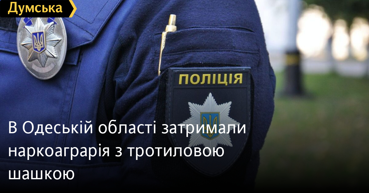 В Одеській області затримали наркоаграрія з тротиловою шашкоюПоліція затримала 33-річного жителя селища Ширяєве, у якого в будинку знайшли понад два кілограми канабісу, тротилову шашку і кілька патронів калібру 5,45. У ГУНП повідомили, що, зі слів затриманого, коноплі він виростив у палісаднику нібито для особистого вживання. Вибухівку та набої, за словами чоловіка, він знайшов у підсобному приміщенні у квартирі покійної бабусі. Відкрито кримінальне провадження за статтями 263 і 309 Кримінального кодексу України (незаконний обіг наркотиків, незаконне зберігання боєприпасів і вибухівки). Помітили помилку? Виділяйте слова з помилкою та натискайте control-enter Новини по цій темі: 29 липня 2025: В Усатово Одеської області сталася перестрілка: поліція працює на місці (відео, оновлено) 28 липня 2025: П'яний на "Ягуарі" або гіпертонік? Звільнений топ-посадовець одеської поліції хоче повернутися на службу 19 червня 2025: Дівчинку, яку шукали сотні одеситів, знайшли вбитою: поліція працює з чоловіком, ймовірно причетним до загибелі 27 травня 2025: Увели гектар в університету: на Одещині засудили земельних аферистів, але без посадки і Хвоста |