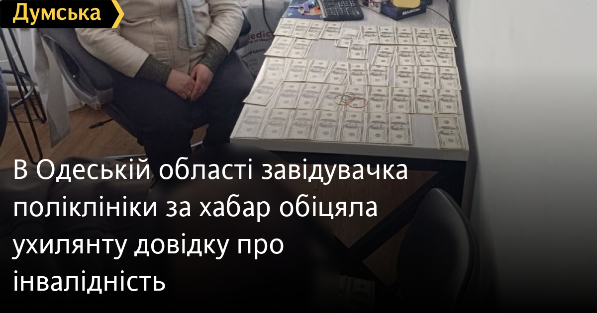 Як повідомили у пресслужбі поліції області, медик отримала вісім тисяч доларів. За ці гроші вона обіцяла оформити чоловікові другу групу інвалідності, щоб він отримав відстрочку від мобілізації та зміг виїхати за кордон.