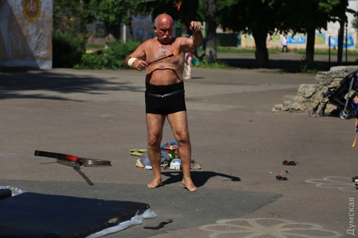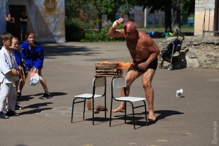 Позже он стал тренером и до сих пор учит подрастающее поколение не сидеть часами у компьютеров, а тренировать тело и закалять волю. Сегодня силач показывал молодежи свои трюки — сгибал широкие стальные ленты, гнул двухсотмиллиметровые гвозди и разбивал несколько слоев горящей черепицы.