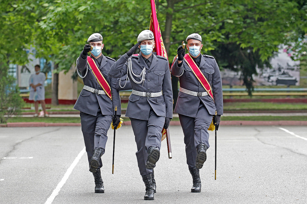 Молодых офицеров приветствовал президент Украины Владимир Зеленский. Правда, дистанционно: речь верховного главнокомандующего прокрутили в записи. Руководитель государства пожелал выпускникам успехов в службе и борьбе с агрессором — Российской Федерацией (так и сказал, честное слово).