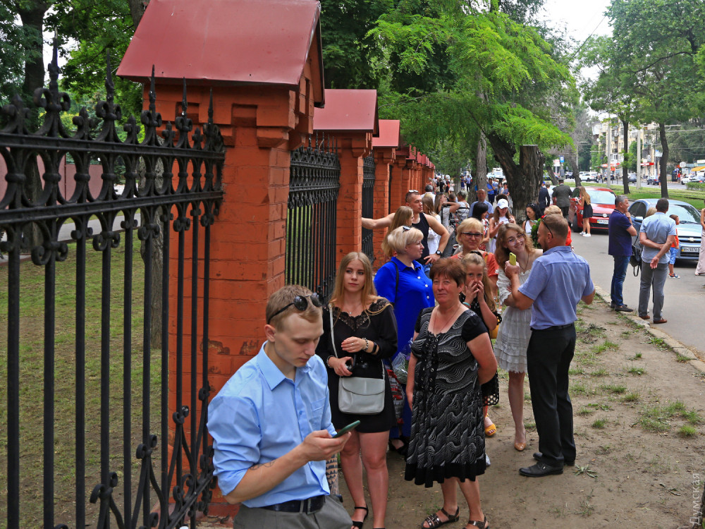 В связи с эпидемией коронавирусной инфекции родных и близких выпускников не пустили на территорию учебного заведения — они наблюдали за церемонией через ограду.