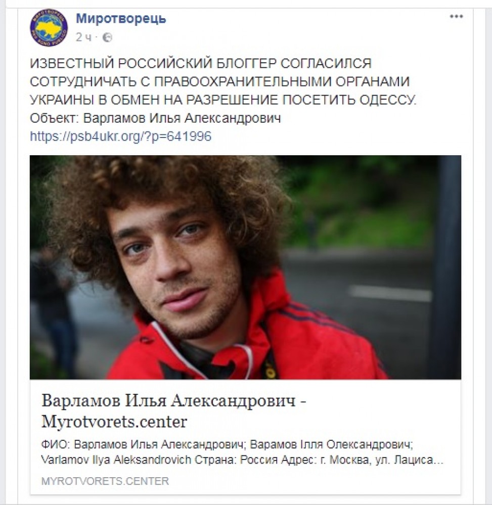 ОБНОВЛЕНО в 15:37. По данным центра «Миротворец», Варламову разрешили посетить Одессу в обмен на сотрудничество с правоохранительными органами Украины. В то же время сообщений от правоохранителей о том, что запрет на въезд отменен, пока нет.