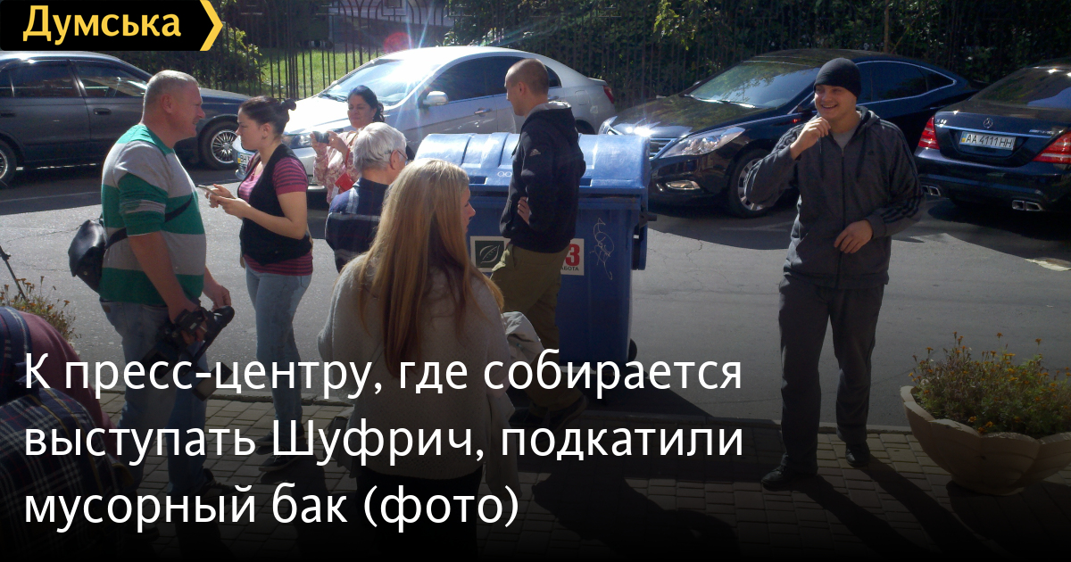 Как передает корреспондент «Думской», к зданию пресс-центра на проспекте Шевченко, где скоро должна начаться пресс-конференция политика, подкатили мусорный бак.