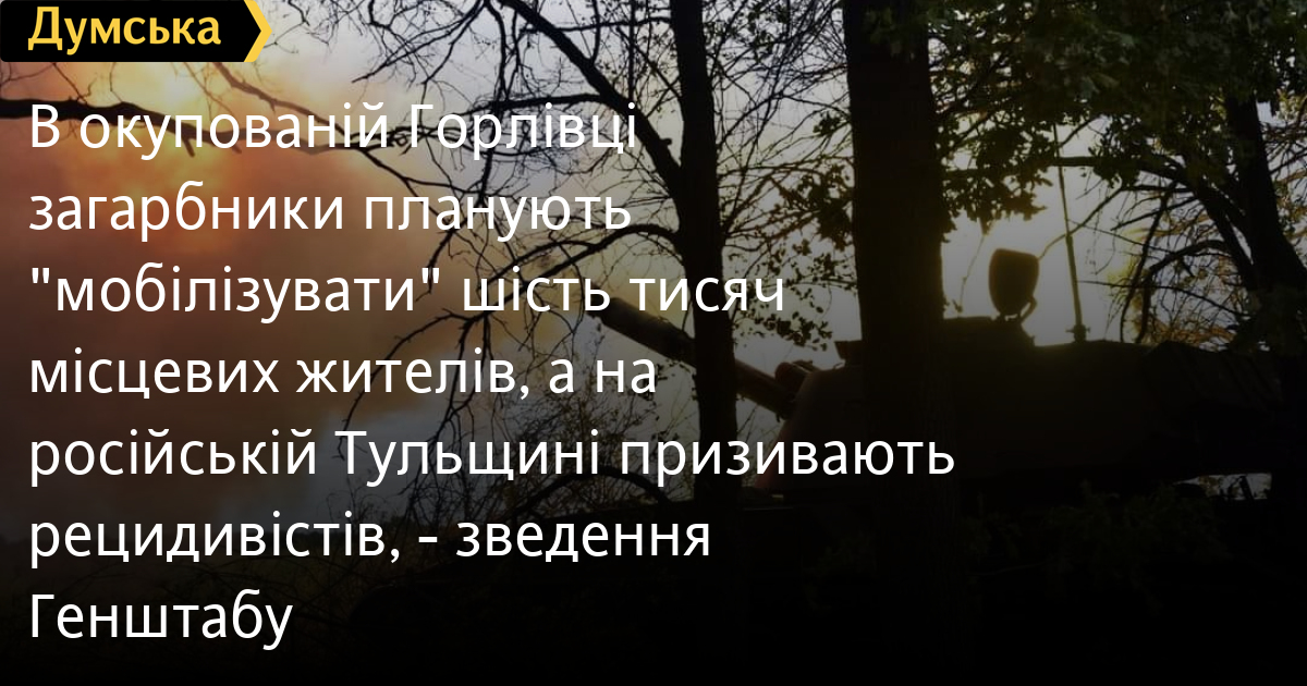 В окупованій Горлівці загарбники планують «мобілізувати» шість тисяч місцевих жителів, а на російській Тульщині призивають рецидивістів, — зведення ГенштабуПід час примусової мобілізації в окупованій Горлівці загарбники планують набрати шість тисяч осіб, а Тульській області — призивають ув'язнених. Пропроблеми з комплектуванням ворожих підрозділів особовим складом йдеться в ранковому зведенні Генерального штабу збройних сил України. У Горлівці, місцеві так звані «військкомати» отримали завдання разом з «міліцією» до 19 вересня набрати шість тисяч осіб під час примусової мобілізації. У місті триває розшук та затримання чоловіків, що викликає масове невдоволення місцевих жителів. Російські вербувальники шукають новобранців в колоніях Тульської області. Охочим обіцяють зняття судимості в обмін на три місяці служби, для рецидивістів або засуджених за особливо тяжкі злочини термін вдвічі довший — півроку. Проте жодні контракти з ув'язненими не підписуються. Також триває набір, так званих «резервістів» до складу 3-го армійського корпусу. Серед вже набраного особового складу велика кількість наркоманів та алкоголіків. Сили оборони успішно відбили атаки противника в районах населених пунктів Спірне, Майорськ, Одрадівка, Весела Долина, Водяне, Авдіївка, Безіменне та Новогригорівка. Протягом доби, для підтримки дій наземних угруповань, авіація Сил оборони завдала 12 ударів по місцях зосередження живої сили та техніки противника. Крім того, підрозділи протиповітряної оборони наших військ на різних напрямках знищили два ворожі літаки (Су-25 та Су-24М), один вертоліт Мі-8 та БпЛА. Підрозділи ракетних військ і артилерії завдали ураження по 9 пунктах управління бригадного та батальйонного рівнів і по 3 районах зосередження живої сили та бойової техніки противника. Втрати російських окупантів наразі уточнюються. СМЕРТЬ РОСІЙСЬКИМ ОКУПАНТАМ! Помітили помилку? Виділяйте слова з помилкою та натискайте control-enter |