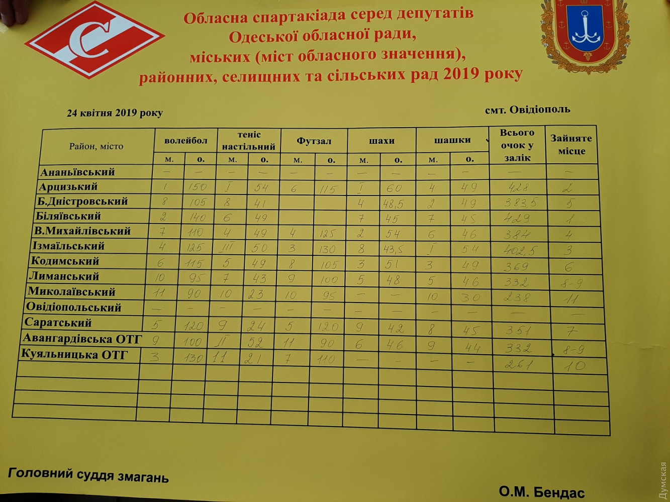 В Овидиополе прошел областной этап депутатской спартакиады — победила команда Беляевки24 апреля в городе Овидиополь прошел областной этап всеукраинской спартакиады среди депутатов местных советов. Депутаты соревновались в нескольких видах спорта – футзал, волейбол, настольный теннис, шахматы, шашки. Победителем соревнований стала команда Беляевского района, которая набрала 429 очков в общем зачете. Как рассказал капитан беляевской сборной Денис Ткаченко, в состав команды в нынешнем году вошли представители Маякской, Беляевской и Ясковской ОТГ. Решение о создании единой команды было принято после того как в минувшем году на депутатской спартакиаде Беляевский район представляли сразу три команды (Беляевского района, Беляевской ОТГ и Маякской ОТГ) и это не позволило достичь высоких результатов. Для участия во всеукраинском этапе соревнований на базе команды Беляевского района будет создана сборная области. В тройку лидеров также вошли команды Арцизского и Измаильского районов. Примечательно, что разрыв между первым и вторым местом составило всего одно очко. СМЕРТЬ РОСІЙСЬКИМ ОКУПАНТАМ! Помітили помилку? Виділяйте слова з помилкою та натискайте control-enter |