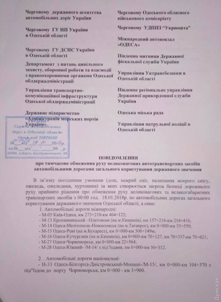 В ожидании непогоды: с полуночи трассы Одесской области закрываются для крупногабаритного транспортаС наступлением 00:00 18 января трассы общего пользования государственного значения Одесской области закроют для крупногабаритного и крупнотоннажного транспорта. Соответствующее распоряжение подписал глава службы автомобильных дорог Одесской области Олег Варивода. В частности, закрытыми будут дороги Одесса-Киев, Одесса- Рени, Одесса-Южный, Одесса-Кучурганы, Одесса-Черноморск. «Непогода, о которой так долго предупреждал Укргидрометцентр, уже на пороге. Поэтому прошу всех по возможности не выезжать без существенной необходимости, а водителям грузовиков просьба не прорываться – бесполезно», — отметил Варивода. Напомним, 18 января ожидается существенное ухудшение погодных условий с сильным ветром и осадками. СМЕРТЬ РОСІЙСЬКИМ ОКУПАНТАМ! Помітили помилку? Виділяйте слова з помилкою та натискайте control-enter |