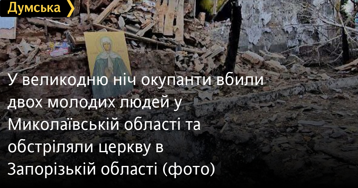 Крім того, ворожі ракети прилетіли і в Запорізьку область. Голова ОВА Юрій Малашко повідомив, що в Комишувасі ворожа ракета пошкодила церкву. На щастя, великодню службу в ній не проводили, тому ніхто не постраждав. Також пошкоджено будинки поруч.