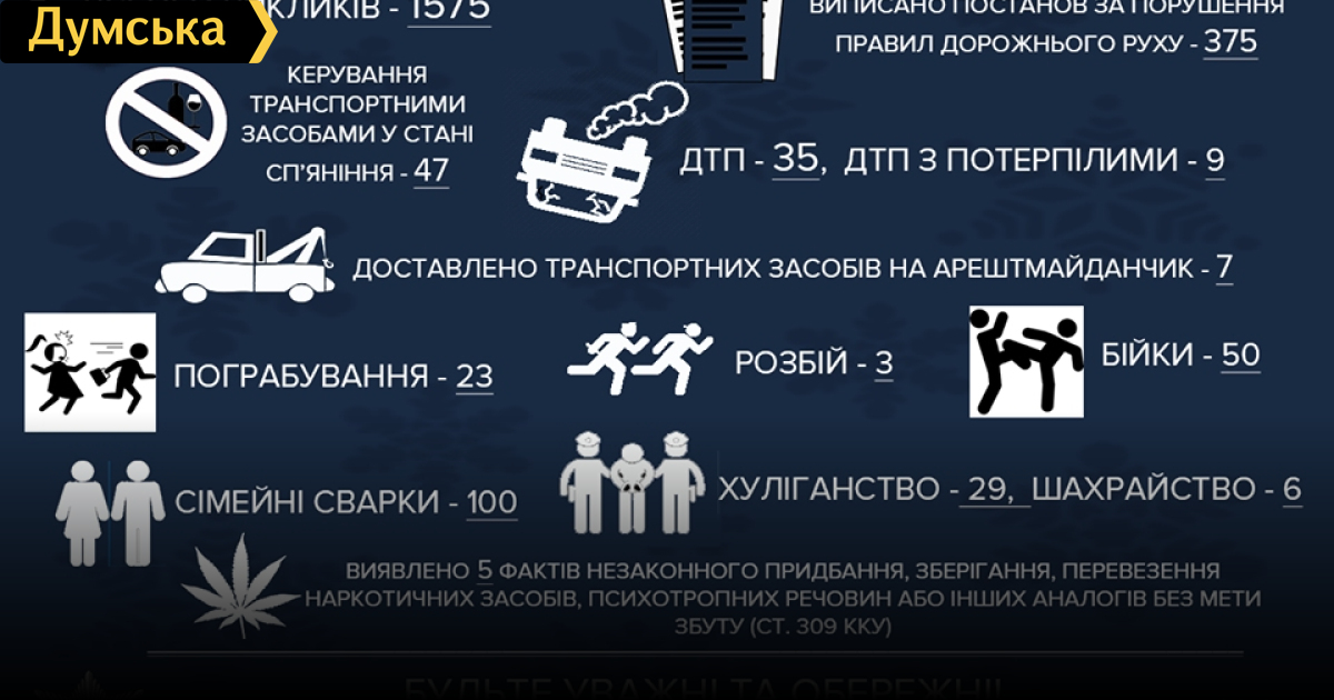 В первые дни нового года в Одессе произошло 50 драк и 100 семейных ссор с насилиемПатрульная полиция Одессы сообщает статистику по происшествиям первых дней нового года. Так, всего патрульных вызывали 1575 раз. В 35 случаях — на ДТП, причем 9 аварий были с потерпевшими. 23 раза полиция прибывала на ограбления, три раза — на место разбойного нападения, 50 раз - на драки, 100 раз - на семейные ссоры, сопровождавшиеся насилием. Зафиксировано 29 случаев хулиганства, 6 - мошенничества, 5 фактов незаконного оборота наркотиков, 47 случаев управления транспортными средствами в состоянии алкогольного опьянения, 375 нарушений ПДД. СМЕРТЬ РОСІЙСЬКИМ ОКУПАНТАМ! Помітили помилку? Виділяйте слова з помилкою та натискайте control-enter Новини по цій темі: 29 липня 2025: В Усатово Одеської області сталася перестрілка: поліція працює на місці (відео, оновлено) 28 липня 2025: П'яний на "Ягуарі" або гіпертонік? Звільнений топ-посадовець одеської поліції хоче повернутися на службу 19 червня 2025: Дівчинку, яку шукали сотні одеситів, знайшли вбитою: поліція працює з чоловіком, ймовірно причетним до загибелі 27 травня 2025: Увели гектар в університету: на Одещині засудили земельних аферистів, але без посадки і Хвоста |