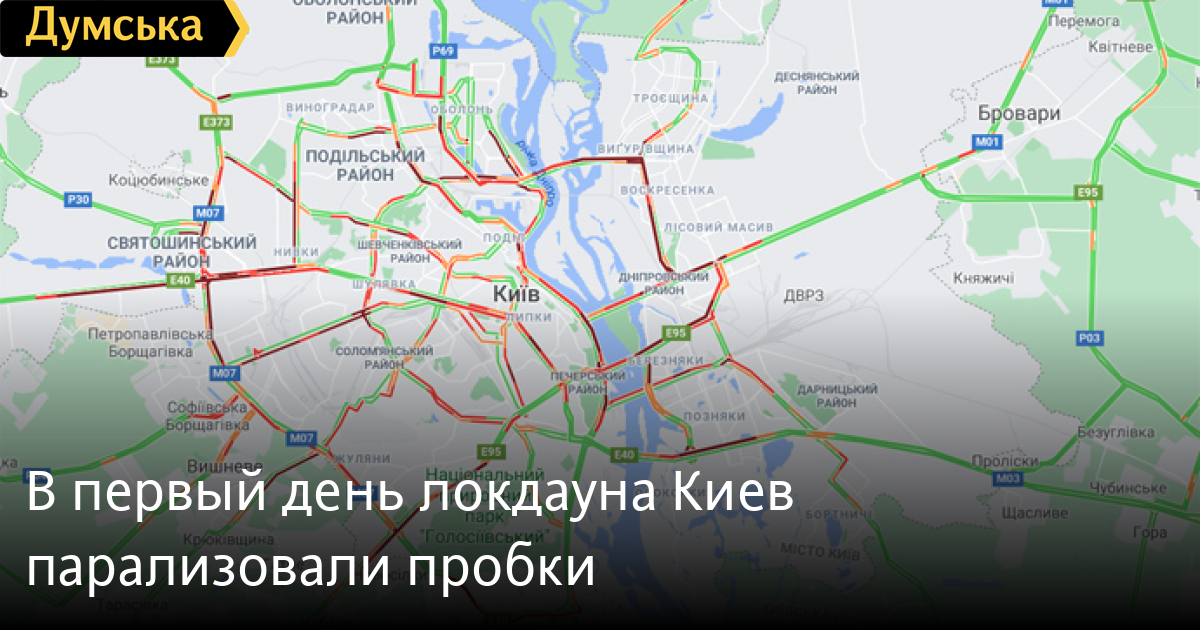 Судя по данным GoogleMaps, сложности с трафиком возникли в центре, в частности, стал Крещатик и окрестные улицы. Также транспорт еле движется на мостах Патона, Северном, Южном и Дарницком через Днепр. Кроме того, проезд оказался затруднен на проспектах Победы, Освободителей, а также Броварском, Бандеры, Шухевича и Бажана.