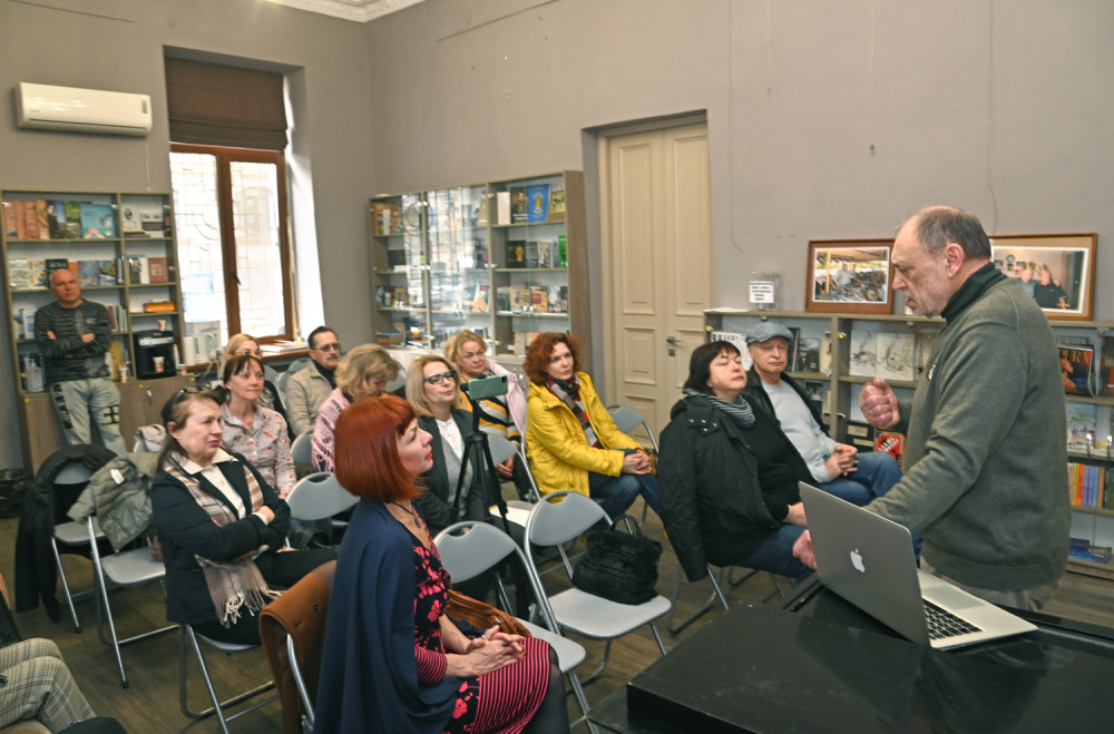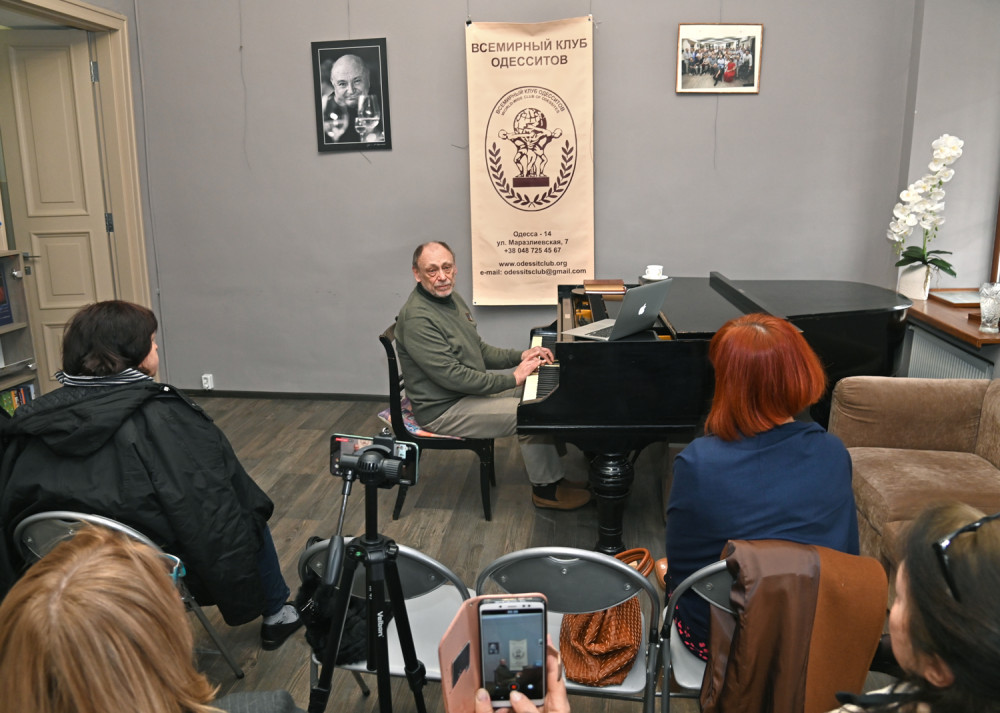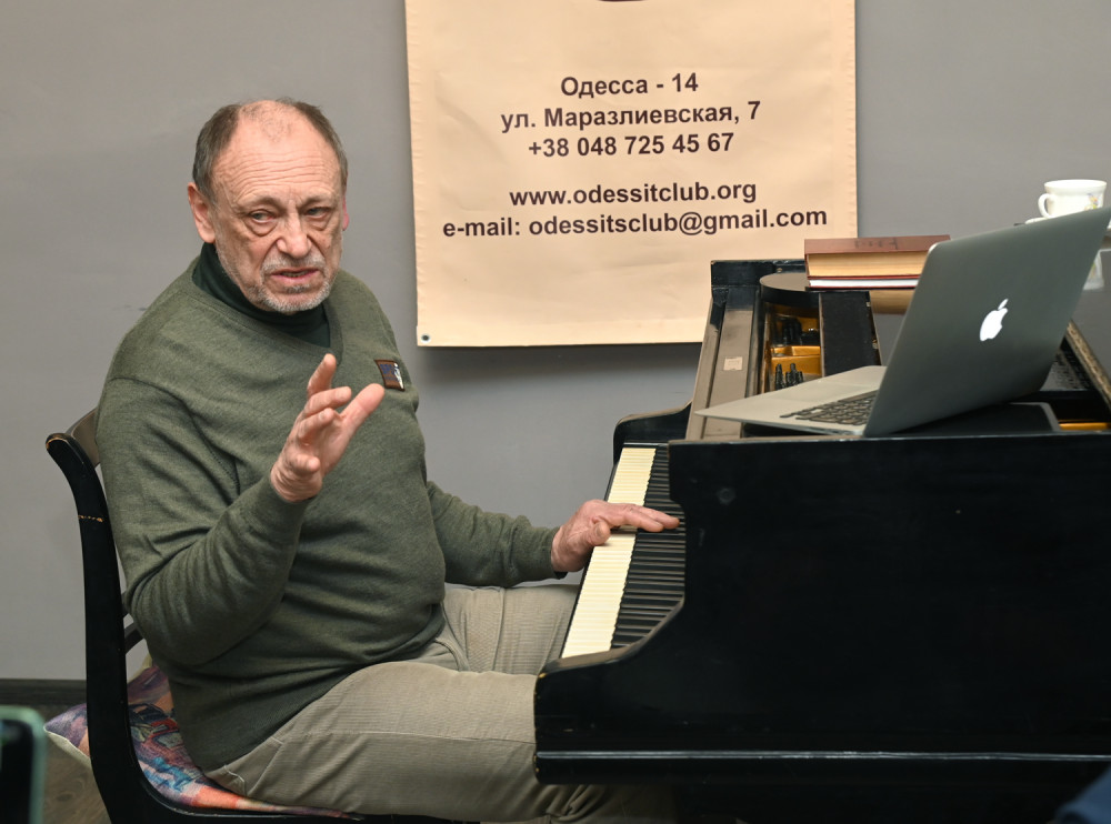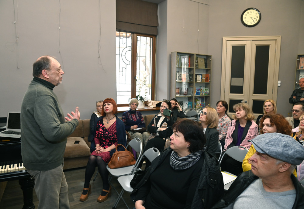 На сей раз это была встреча с Юрием Борисовичем Диким в проекте ВКО «Диалоги у рояля». Юрий Дикий — пианист, член Национального союза журналистов Украины, глава Миссии Давида Ойстраха и Святослава Рихтера, директор международных фестивалей «Рихтерфест» и «Ойстрах-Ассамблеи». Концерт-встреча носил название «Мировая культура и искусство в поисках мира во время войны». В самом начале вечера директор клуба Григорий Барац вручил бойцам теробороны подарки, которые могут в один прекрасный момент сохранить им жизнь.