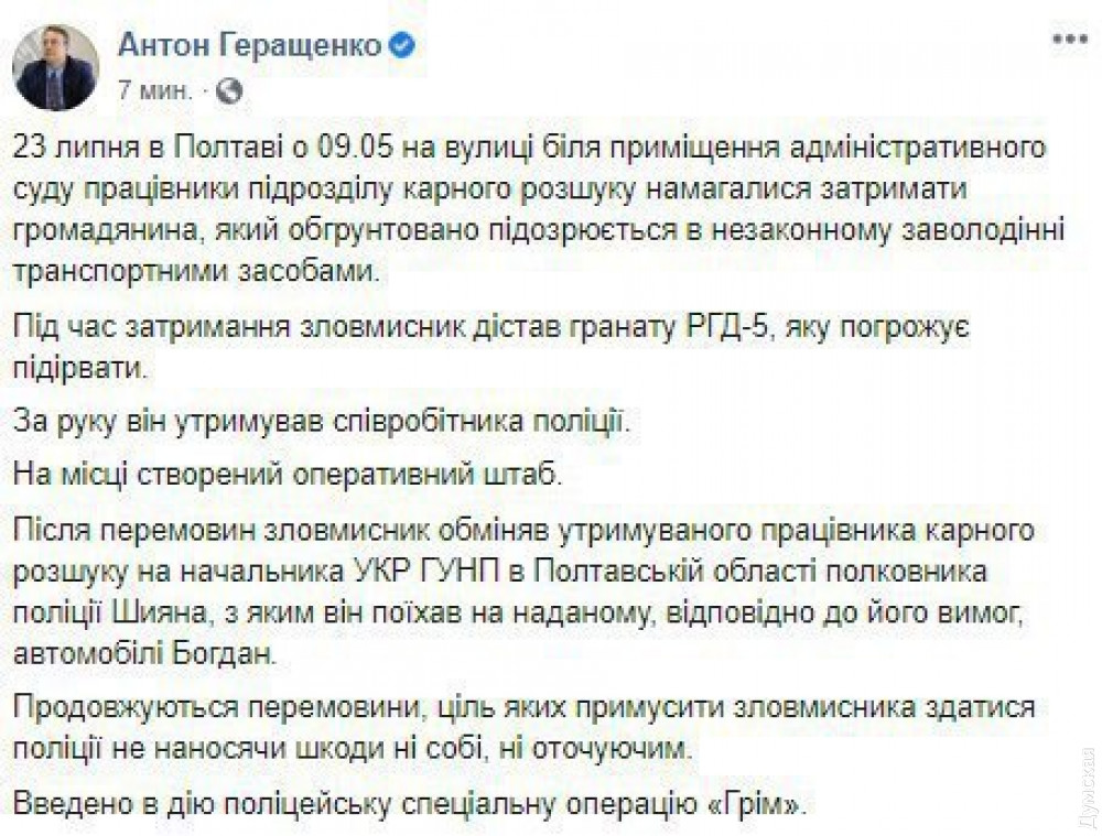 «После переговоров злоумышленник обменял удерживаемого сотрудника уголовного розыска на начальника Управления уголовного розыска ГУНП в Полтавской области полковника полиции Шияна, с которым он уехал на предоставленном согласно требованиям, автомобиле Богдан», — написал Геращенко в Фейсбук.