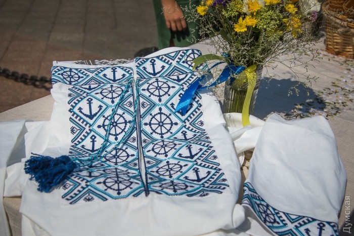 Как передает корреспондент «Думской», в этом году орнамент на украинской рубахе состоял из символичных для Одессы элементов — якорей и корабельных штурвалов. Мастер народной вышивки Татьяна Тамбовцева рассказала журналистам, что на создание рубахи для Дюка ушло два дня и пять метров натуральной ткани.