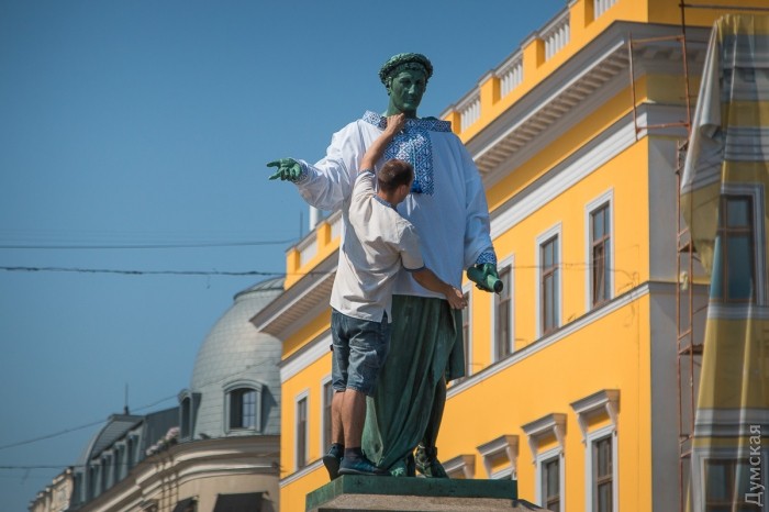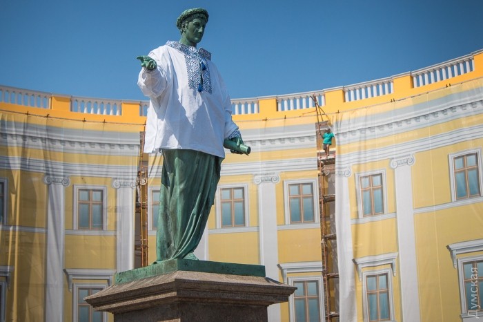 В преддверии девятого Вышиванкового фестиваля, который пройдет с 23 по 27 августа в центре Одессы, по сложившейся традиции национальный наряд примерили на памятник одесскому градоначальнику Арману-Эммануэлю де Ришелье.