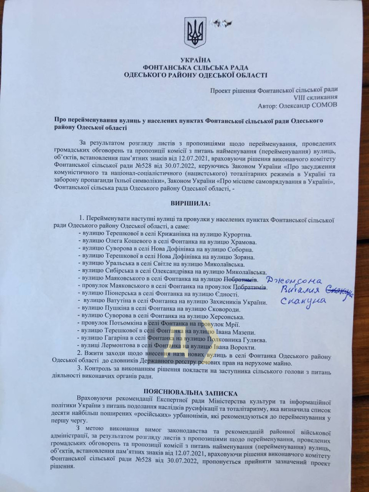 Зокрема, вулиця Маяковського у самій Фонтанці носитиме ім'я колишнього прем'єр-міністра Сполученого Королівства Великої Британії та Північної Ірландії, Почесного громадянина Одеси Бориса Джонсона, а вулиця Гагаріна у тому ж населеному пункті — командира 28-ї бригади імені Лицарів Зимового походу полковника Віталія Гуляєва, який загинув смертю хоробрих у липні на фронті російсько-української війни.