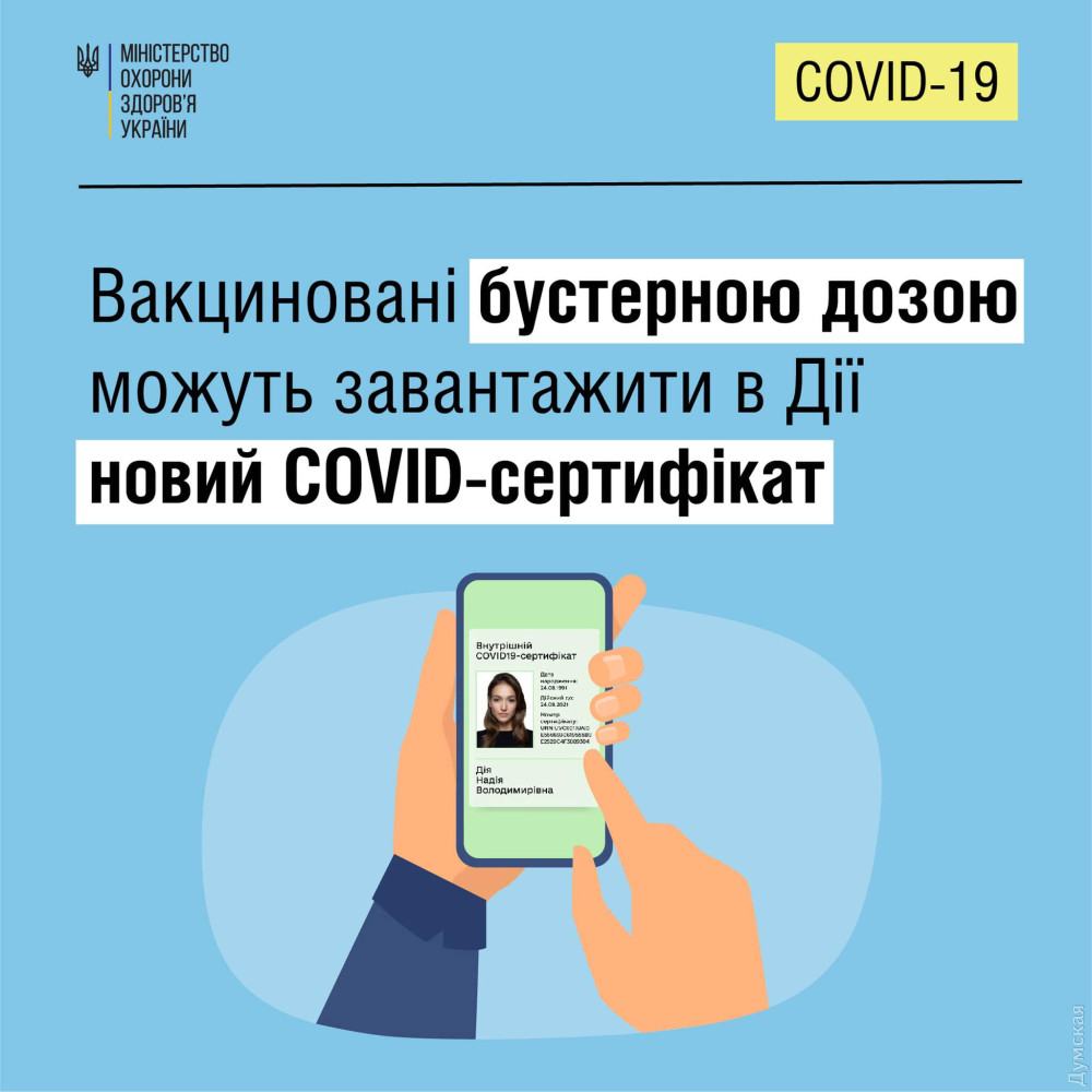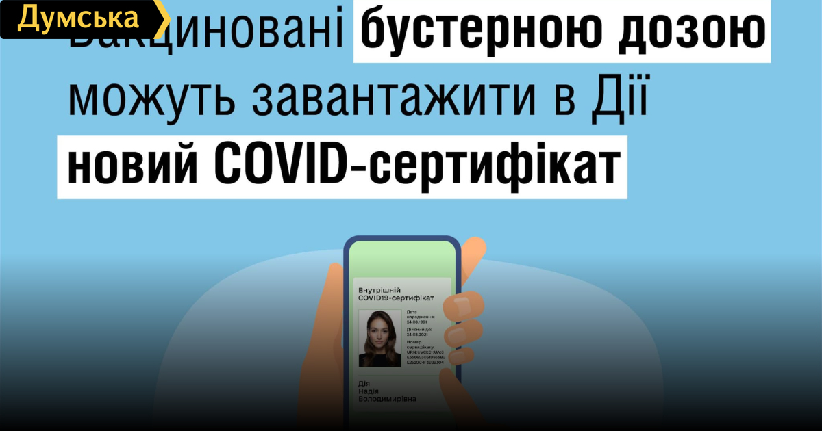 В приложении «Дія» можно сгенерировать сертификат о вакцинации бустерной дозой: документ действует 270 днейНовый COVID-сертификат с сегодняшнего дня могут сгенерировать в приложении «Дія» привитые бустерной дозой украинцы. Как сообщает пресс-служба Минздрава, срок действия такого документа составит 270 дней, как и во всех странах Евросоюза. «Для получения сертификата достаточно отправить соответствующий запрос на портале или в приложении «Дія». Сделать это можно в первый день введения дозы вакцины против COVID-19», — сообщили в МОЗ. Сертификат генерируется при любой из разрешенных схем сочетания вакцин, признанных в Украине. СМЕРТЬ РОСІЙСЬКИМ ОКУПАНТАМ! Помітили помилку? Виділяйте слова з помилкою та натискайте control-enter |