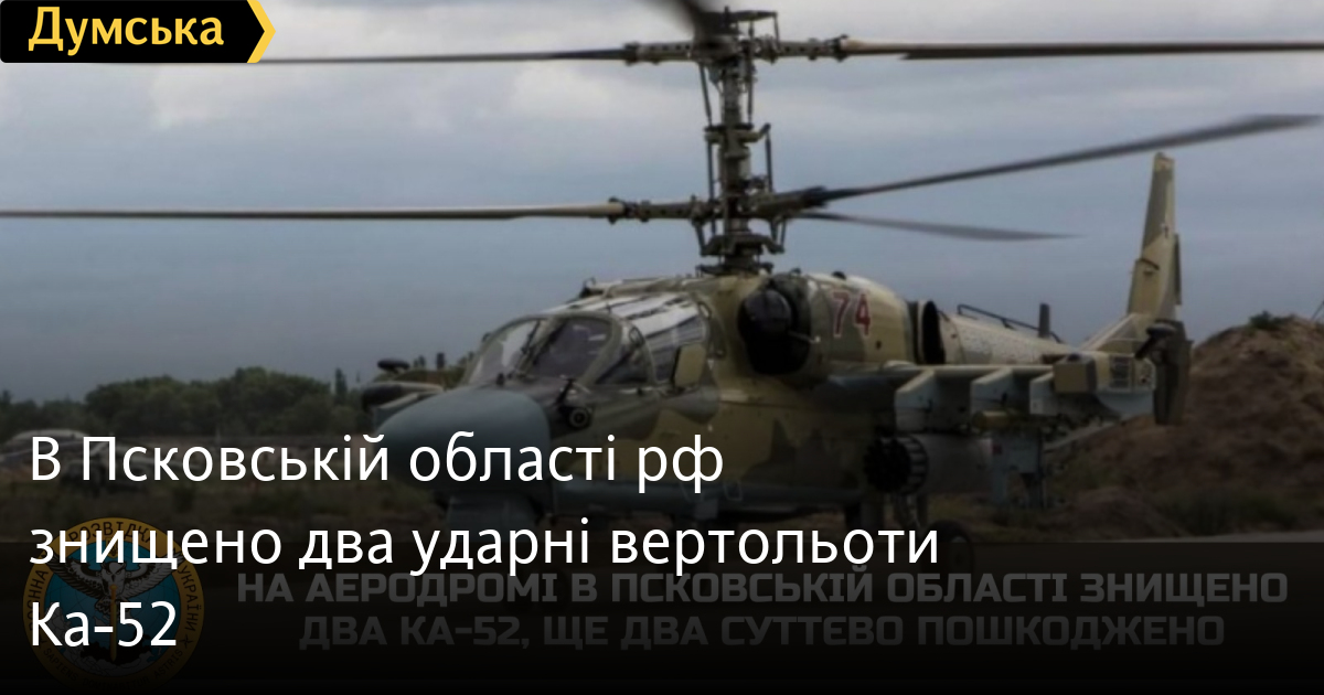 Два російські ударні вертольоти Ка-52 «Алігатор» знищено, а ще два суттєво пошкоджено минулої ночі на аеродромі в Псковській області.