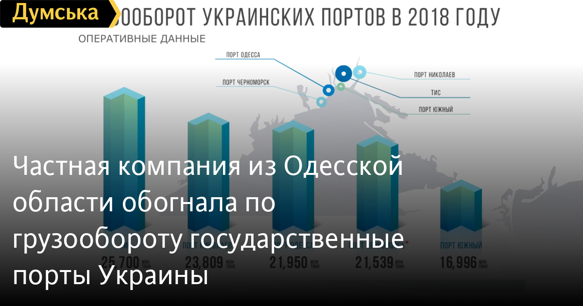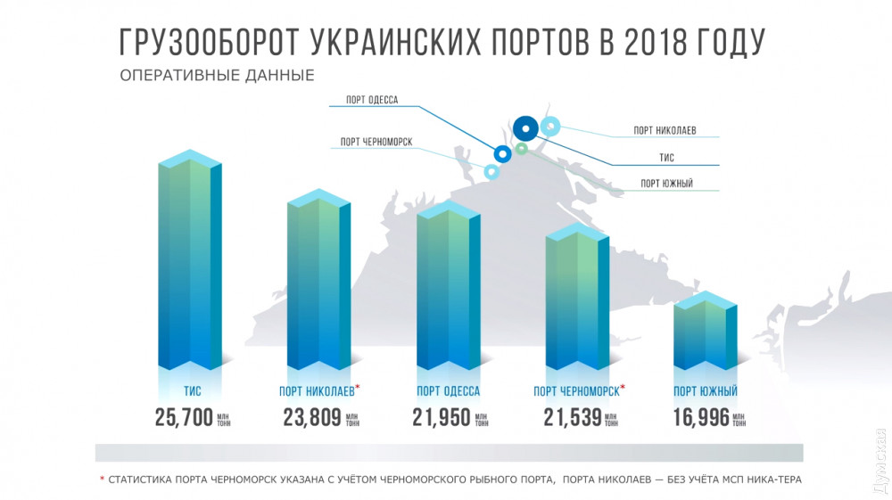 Николаевский морской торговый порт — на втором месте с 23,8 млн тоннами, а грузооборот Одесского морского торгового порта составил в 2018 году 22 млн тонн.